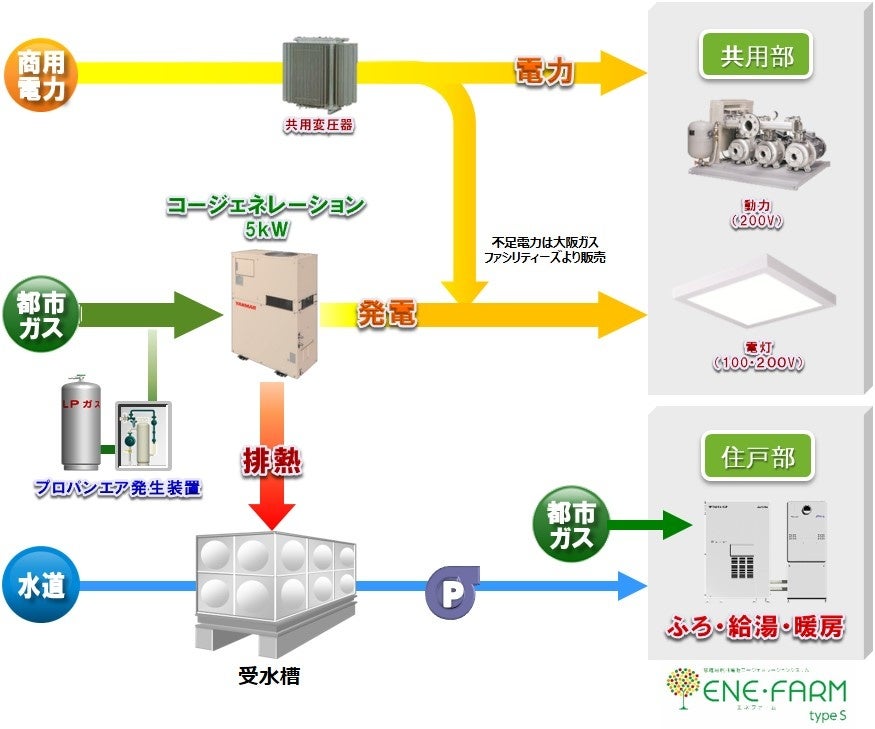 2020年3月に竣工したシーンズ塚口(所在地:兵庫県尼崎市)では、家庭用燃料電池「エネファーム」の全戸設置やその他省エネ機器の採用に加え、共用部に「防災対応型コージェネレーションシステム」を導入し、「低炭素建築物認定」を取得しております。