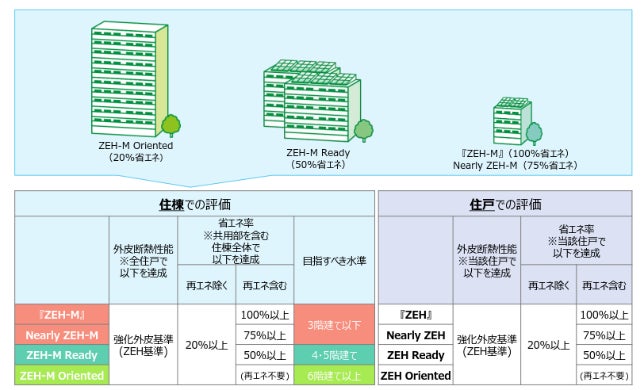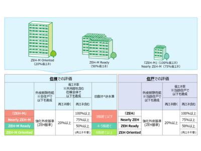 集合住宅におけるZEHには、住戸単位で基準を満たす住戸ZEHと、住棟単位で基準を満たすZEH-Mがあります。それぞれに対し、一次エネルギー収支で100%以上削減の『ZEH』、75%以上削減の「Nearly ZEH」、50%以上削減の「ZEH Ready」、20%以上削減の「ZEH Oriented」といった基準が国で定められています。