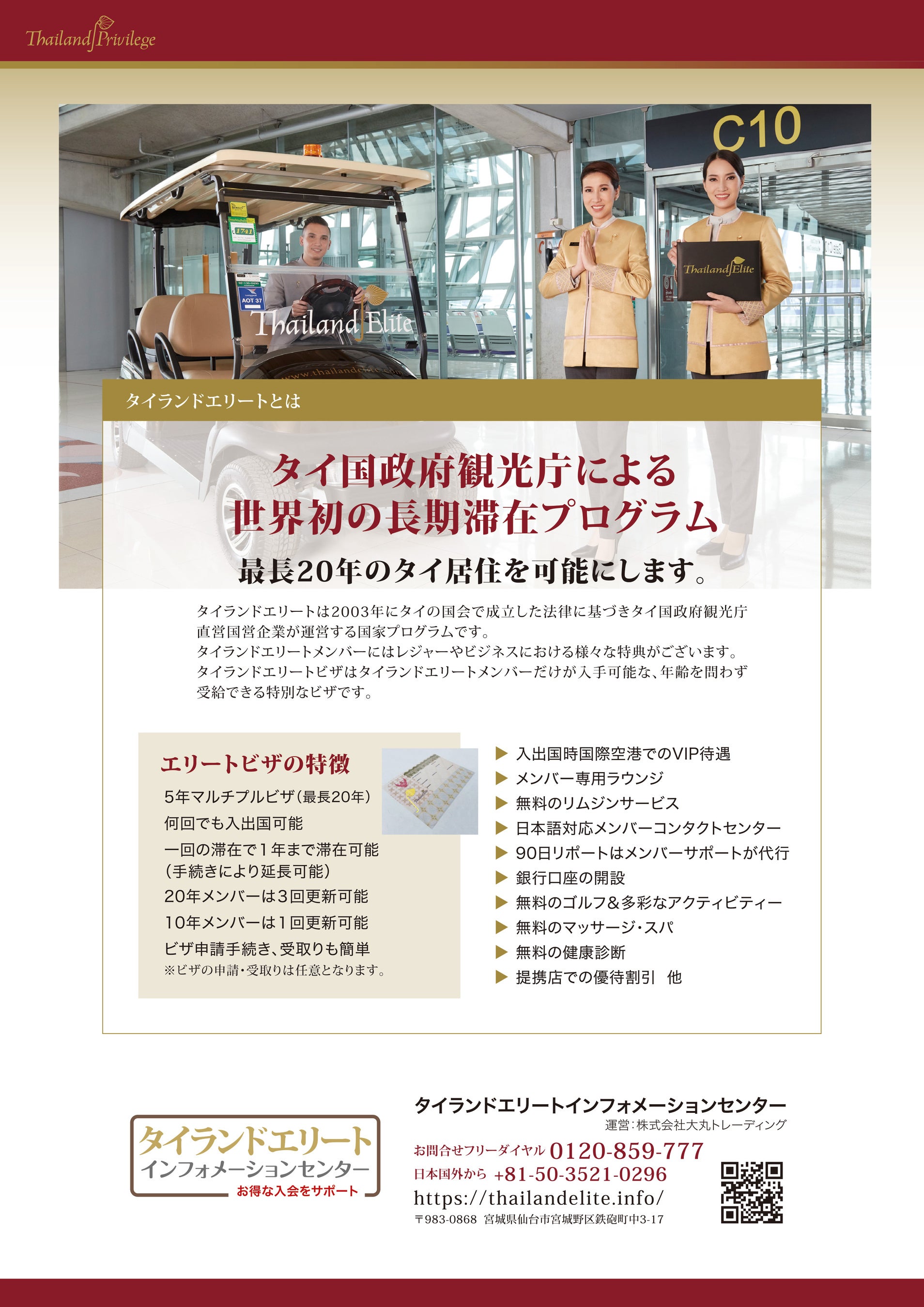 タイの国営企業が運営する「タイランドエリート」に入会することで、最長20年間タイに長期滞在できるビザが入手できる他、タイ銀行口座開設、国際空港におけるVIP待遇など様々な特権をお楽しみいただけます。
