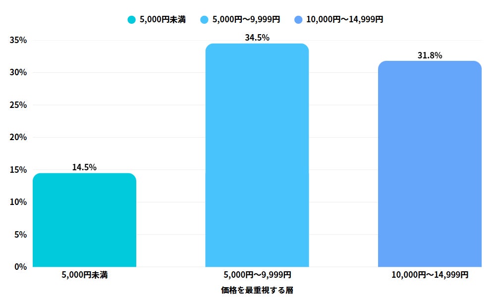 特筆すべきは、「価格」を最重視すると回答した層でも、予算は「5,000円〜9,999円」(34.5%)と「10,000円〜14,999円」(31.8%)に二極化していることです。