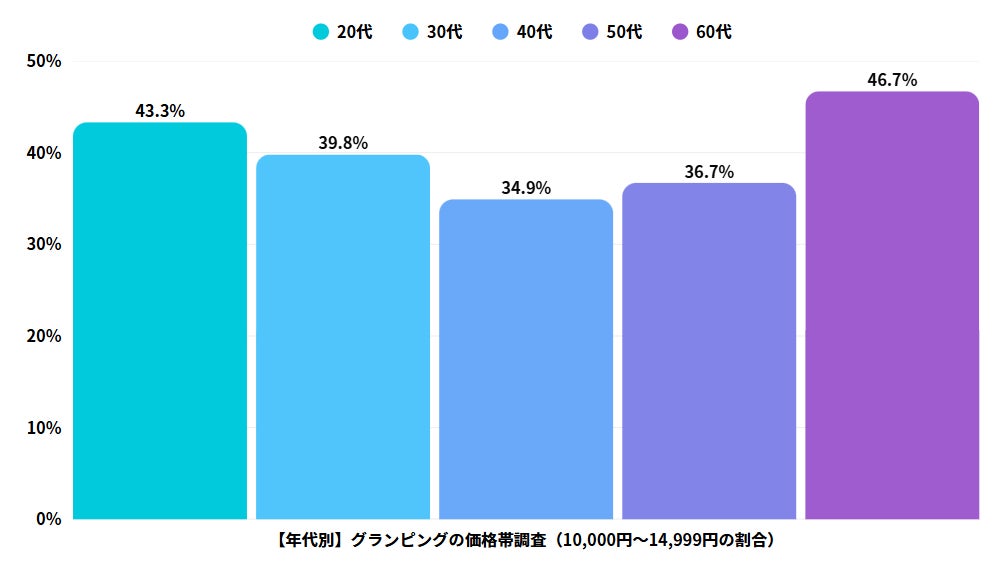 60代が最も高い割合で10,000円台前半を選択しており、グランピングに対して「適正価格でクオリティを求める」姿勢が伺えます。一方、30代では20,000円以上を選ぶ層が16.7%と最も高く、二極化傾向が見られました。