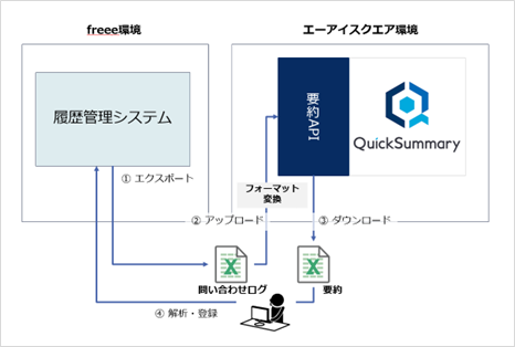 本取組みでは、エーアイスクエアが構築したクラウドストレージ環境(Amazon S3)に、応対履歴データをアップロードし、要約結果を任意のタイミングでエクスポートできる構成を採用しました。履歴管理システムのデータをそのまま活用できるよう、QuickSummary2.0のAPIにあわせ、自動でフォーマット変換する処理も加えています。