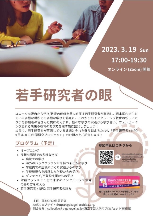 日本OECD共同研究では、東日本大震災から10年の節目である2021年より、毎年、震災からの教訓として「あたりまえを問い直す」ことに焦点を当てたワークショップを3月に開催してきました。今年は、「プロジェクト∞無限大(Project ∞ Infinity)」と「壁のないあそび場-bA-」を軸に、共創パートナーの皆様と、昨年12月に開催されたOECD教育大臣会合の宣言を元に、「日本OECD共同研究月間 “Diversity, Equity and Inclusion (DE&I) in Action(ホンキで、インクルーシブ)” “Diversity, Equity and Inclusion (DE&I) in Action(ホンキで、インクルーシブ)”」(2023年3月3日〜31日) を開催しています。「若手研究者の眼」は、その一環です。