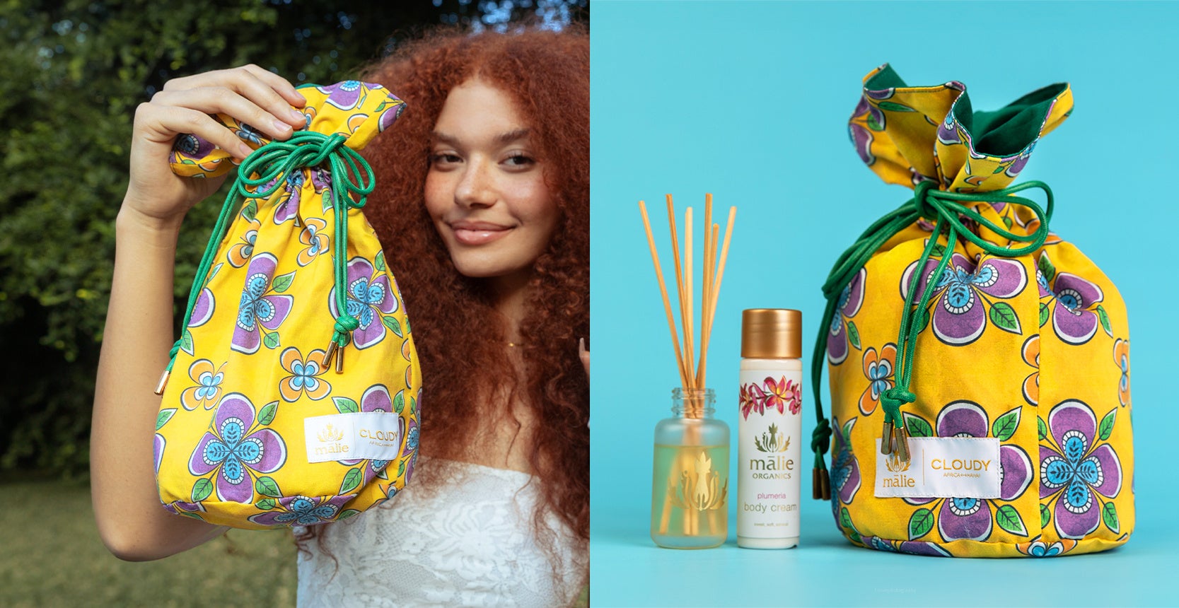 滞在先を居心地の良い空間することにもこだわっている彼女が厳選したMalie Organicsのアイテムを、カラフルなイエローが眩しいCLOUDYのアフリカンテキスタイルの巾着バッグに入れてお届けします。