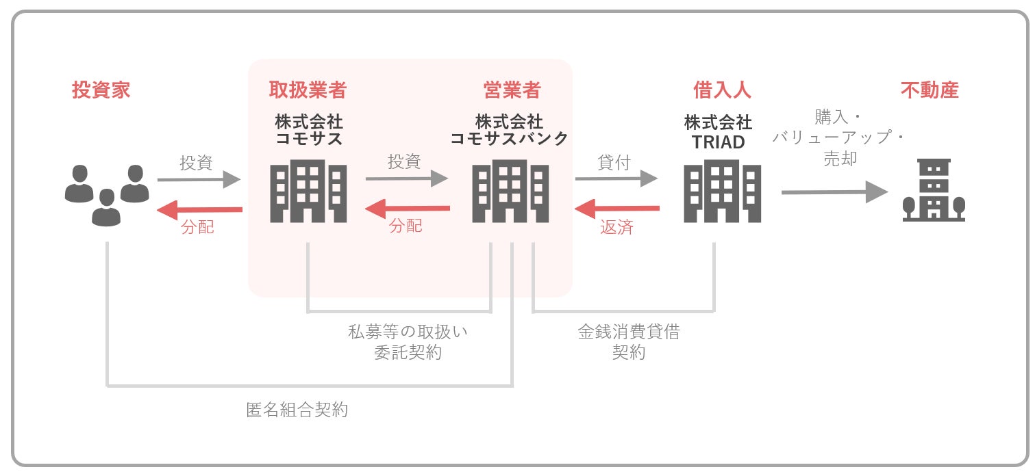※借り手であるTRIAD社は、COMMOSUSを運営する株式会社コモサス、営業者の株式会社コモサスバンクの親会社である株式会社SOCIAL COMMON CAPITALの株主(8.6%)です。本ファンド募集時点において、TRIAD社は株式会社SOCIAL COMMON CAPITALグループ各社に対し直接的な経営への関与は行っておりません。