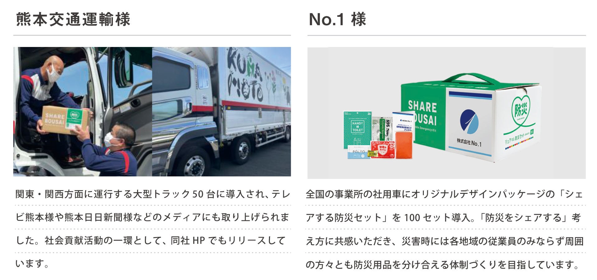 従来より展開している「シェアする防災セット」は、2022年5月の発売以来、400社以上の企業・団体で導入されています。