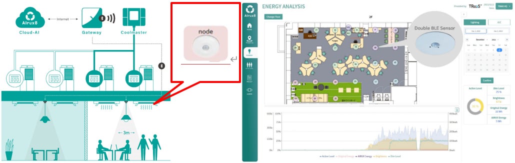 「AIrux8」は、人感センサーを組み込んだ「Node(ノード)」と呼ばれる集中コントローラー装置を通して、施設内の混雑状況や不在状況等のデータを取得し、AIで解析します。そして状況に応じて、施設内に設置されたIoT照明設備と通信し、各照明のエリアグループ毎に時間帯、営業稼働日、季節により照明の明るさを自動制御します。また、「AIrux8」は、施設内空調設備の設定温度も自動調整することができます。従来のエアコンは、温度設定を手動操作もしくはスケジュールで稼働するため、外気温と内部温度・設定温度に大きな差があるときは急速稼働させることとなり、電力使用量が多くなる最大の原因でした。「AIrux8」は、AIで現状把握・予測して緩やかに設定温度を上昇/下降させ、少人数や無人空間といった状況では自動でON/OFFを行うことで、消費電力を抑制します。このように、「AIrux8」は、照明やエアコンを実状況に合わせて適正値に自動制御することで、施設内のエネルギーコストを41%削減した実績があります。