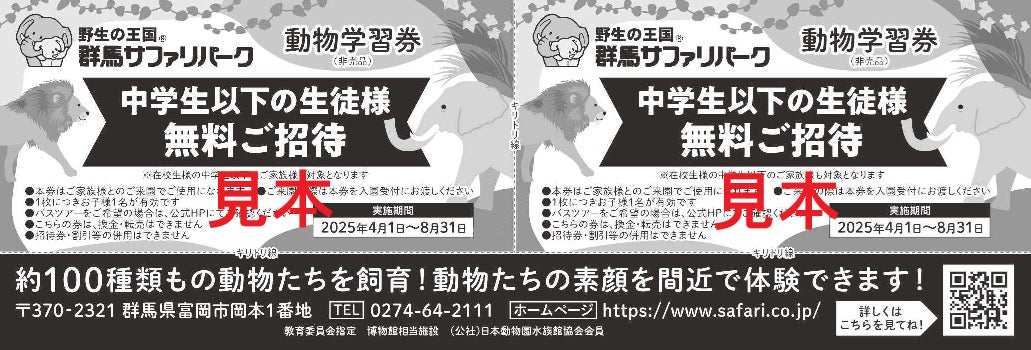 群馬サファリ・ワールド株式会社(本社:群馬県富岡市、代表取締役:菊池祥一)が運営する群馬サファリパーク(群馬県富岡市岡本1番地)は、群馬県内の小中学校の児童・生徒を対象に、当園を無料で利用できる「動物学習券」を無償配布いたします。