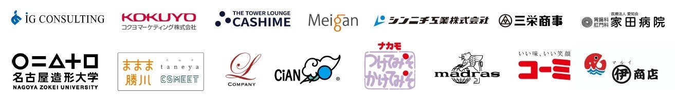株式会社アイジーコンサルティング、コクヨマーケティング株式会社、CASHIME(カシメ)、名古屋眼鏡株式会社、シンニチ工業株式会社、三栄商事株式会社、医療法人愛知会 家田病院、名古屋造形大学、勝川エリア・アセット・マネジメント株式会社、合同会社ライラ・カンパニー、株式会社シアン、ナカモ株式会社、マドラス株式会社、コーミ株式会社、マル伊商店株式会社