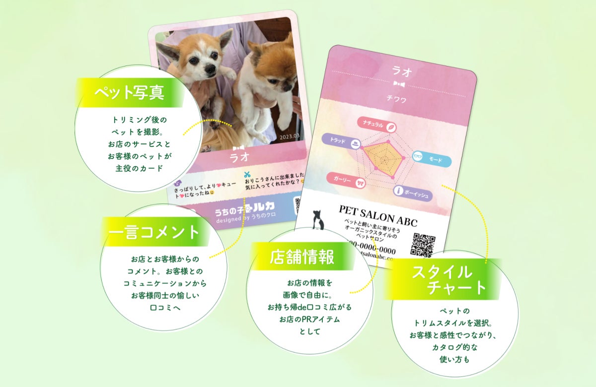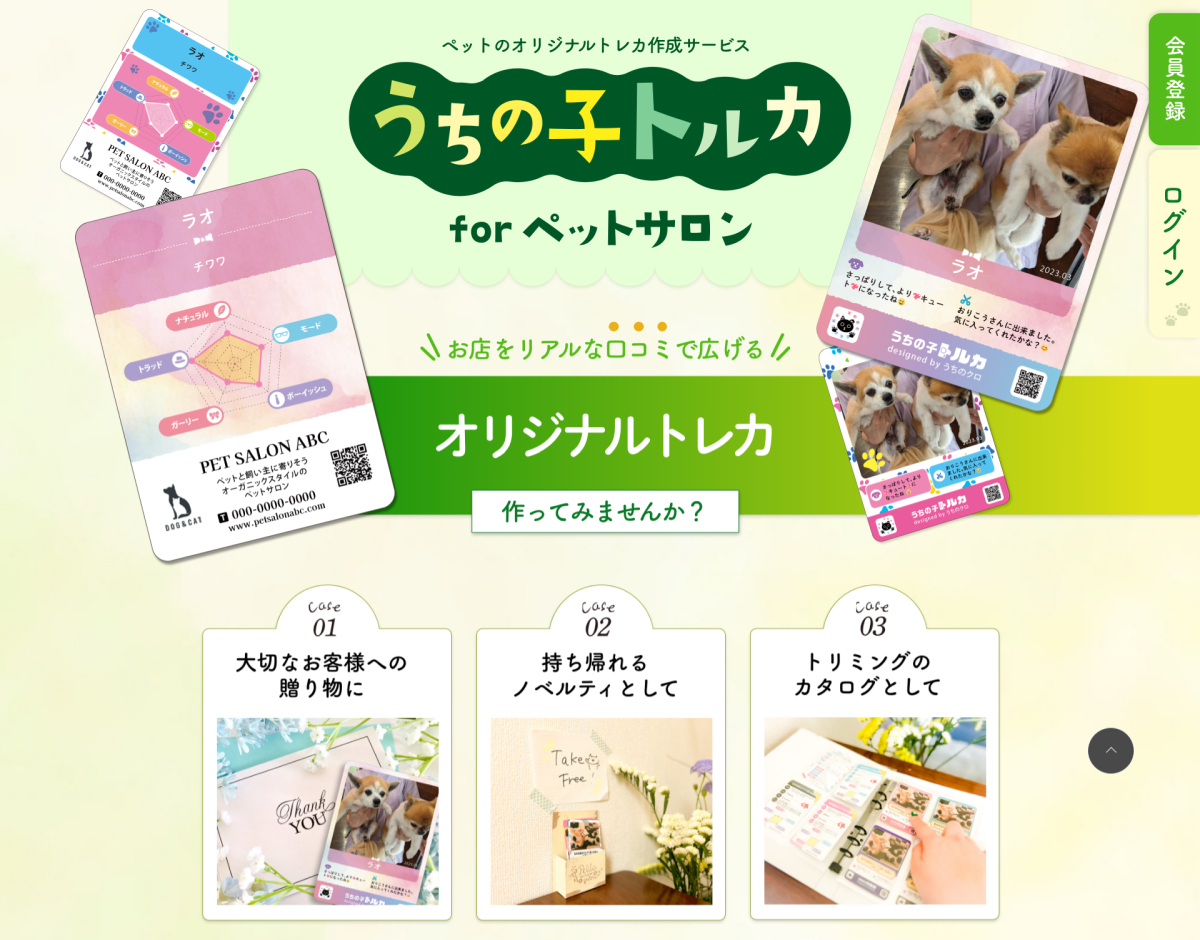 その第一弾として、ペットサロン様を対象に、新たな顧客コミュニケーション&PRアイテムとして【お店のオリジナルトレカ】が、Web上で簡単に作成できる『うちの子トルカ for ペットサロン』の本サービスを、8月24日から開始いたしました。