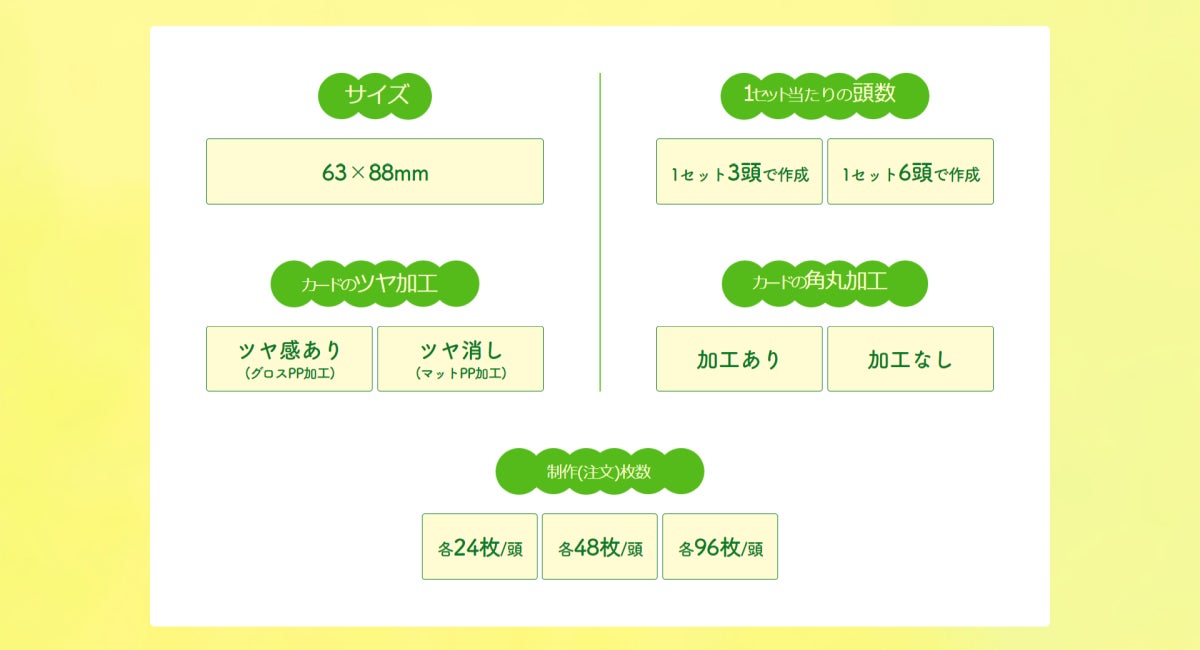 * 1セット6頭で作成/ツヤ感あり/角丸加工なし/各96枚の場合(送料別)