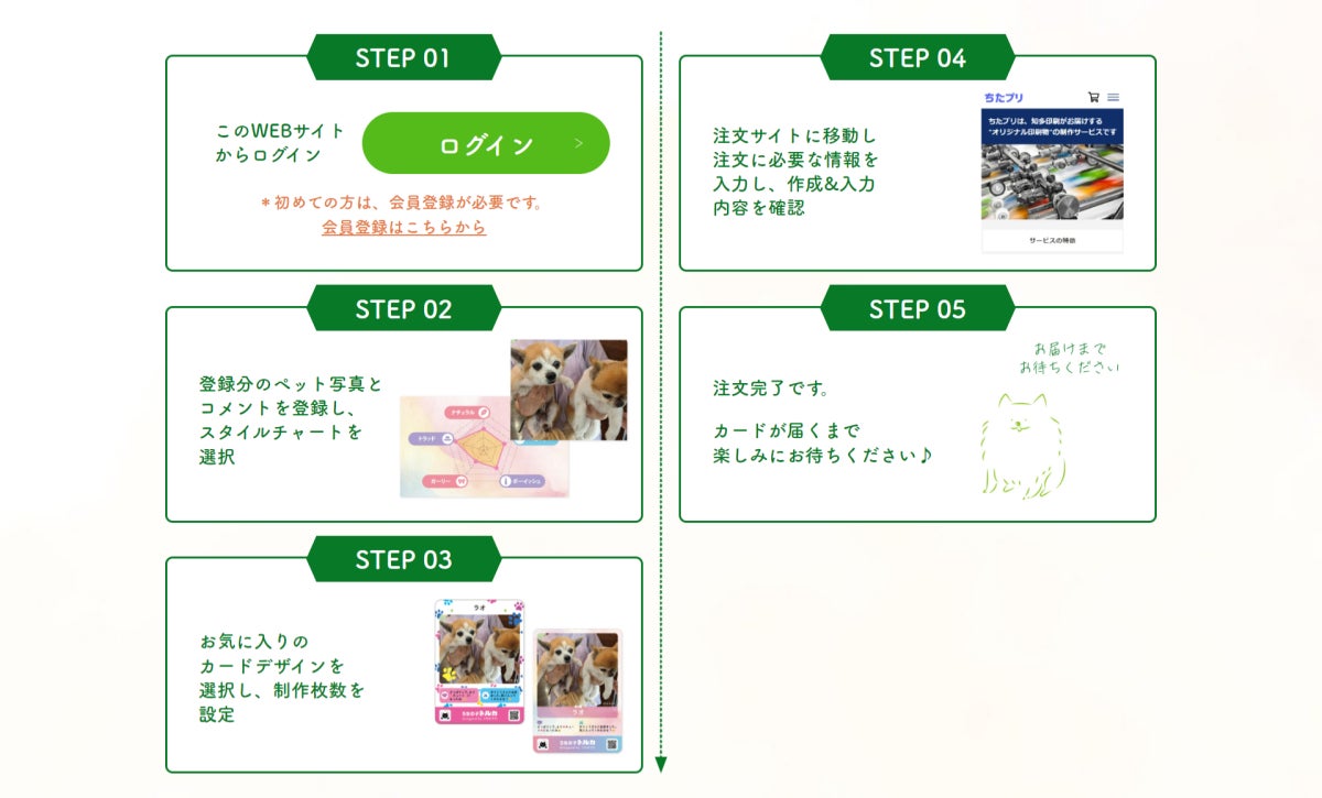 お客様のペットを撮影した写真とコメントを登録するだけで、Web上で簡単にお店のオリジナルトレカが作成でき、連携するプリントサービス『ちたプリ*』を通じて印刷&お届けするWeb完結型のサービスです。