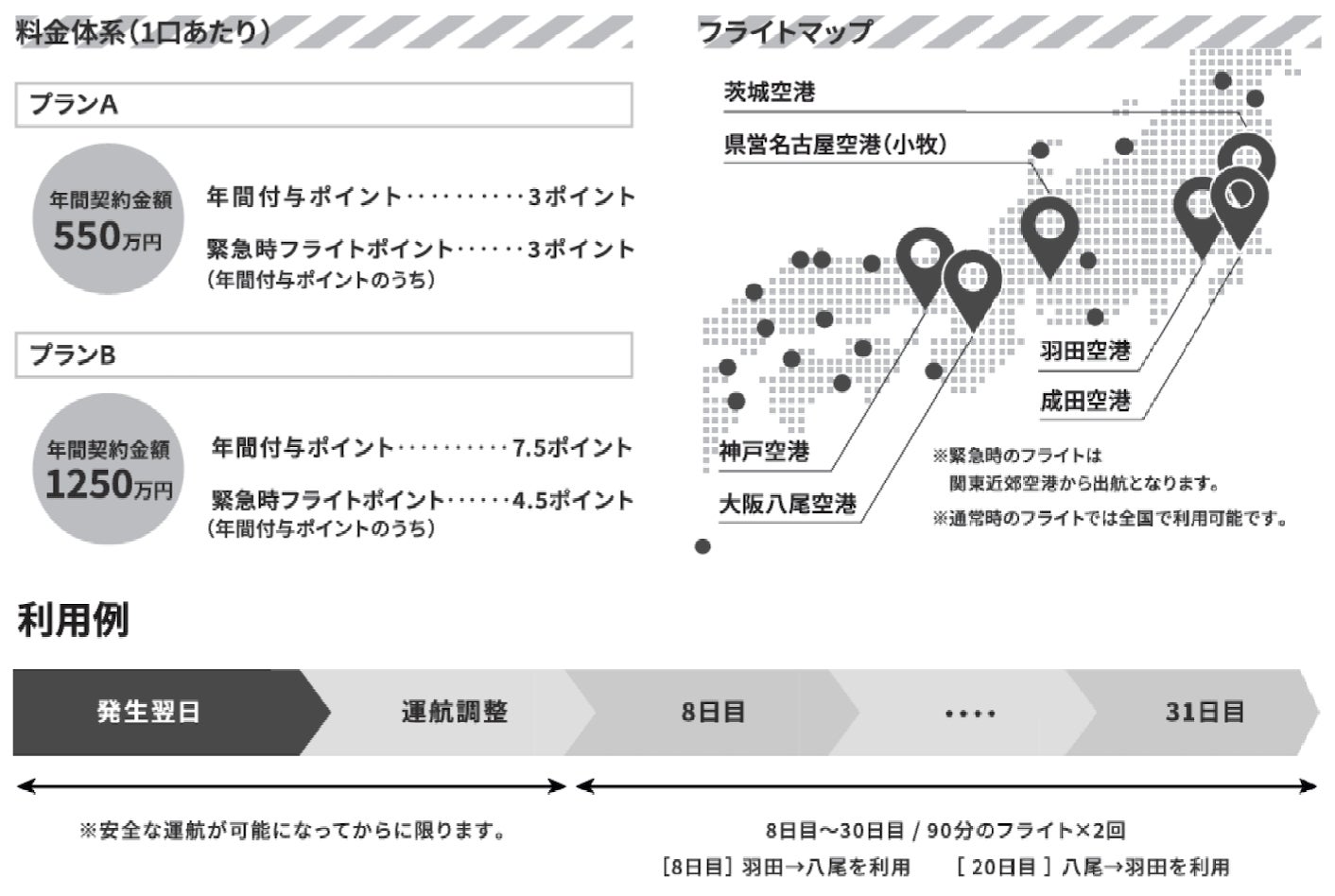 本プランでは、緊急時にプライベートジェットを活用し、迅速な人員や物資の移動により被害を最小限に抑え、事態発生後の円滑な事業継続に貢献いたします。