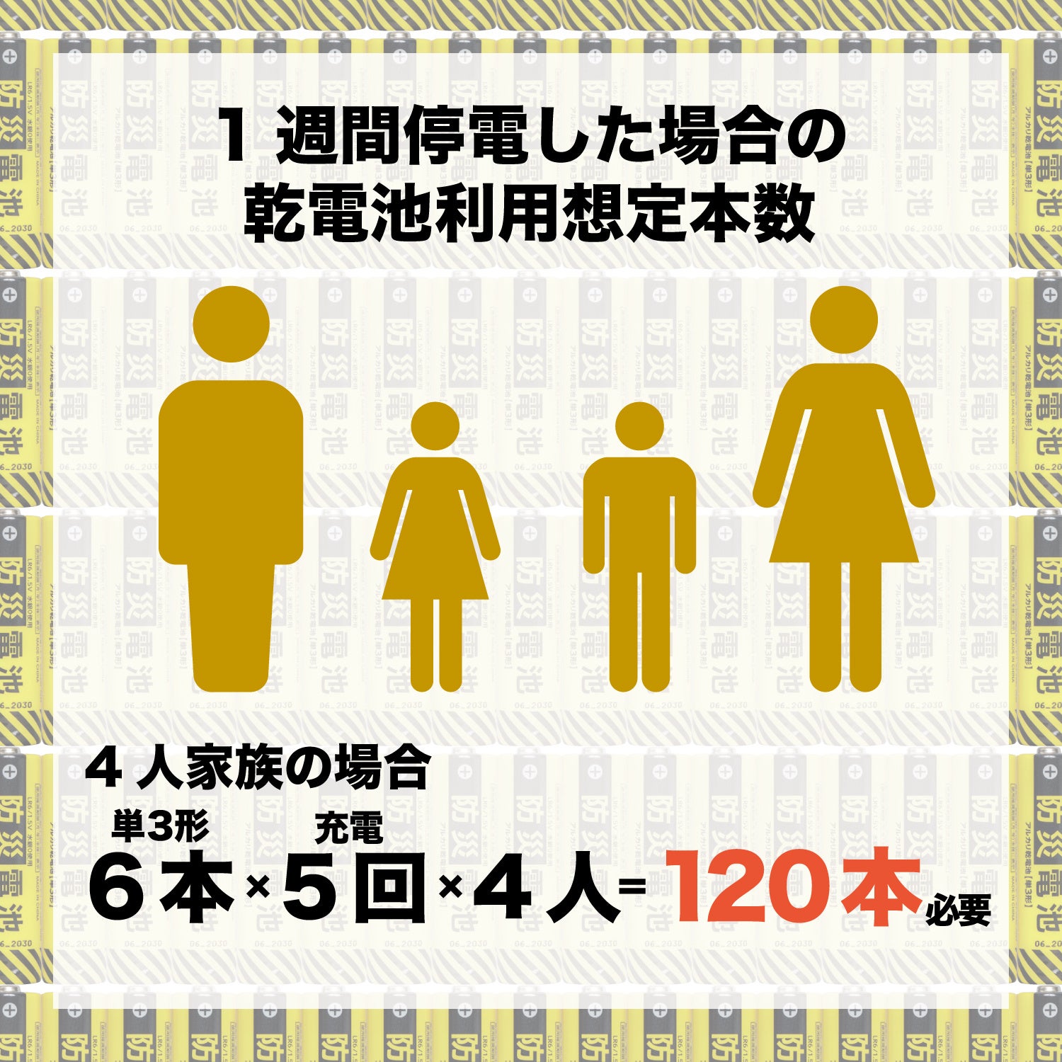 スマートフォン用のモバイルバッテリーは、リチウムイオンバッテリーが主流ですが、停電時に繰り返し充電できないという問題があります。当社の「防災充電器」は、乾電池の補充さえあれば、何度も充電することが可能です。災害・停電が長期化した場合、予備の乾電池が非常に重要となります。仮に、4人家族で4台のスマートフォンを充電する場合、1週間で約120本と非常に多くの乾電池を充電に消費します(1週間で、機器4台を5回充電すると想定した場合。※以下参照)。日ごろから多めに備蓄し、日常でも使用しながら買い足していくローリングストックを心掛けることが大切です。