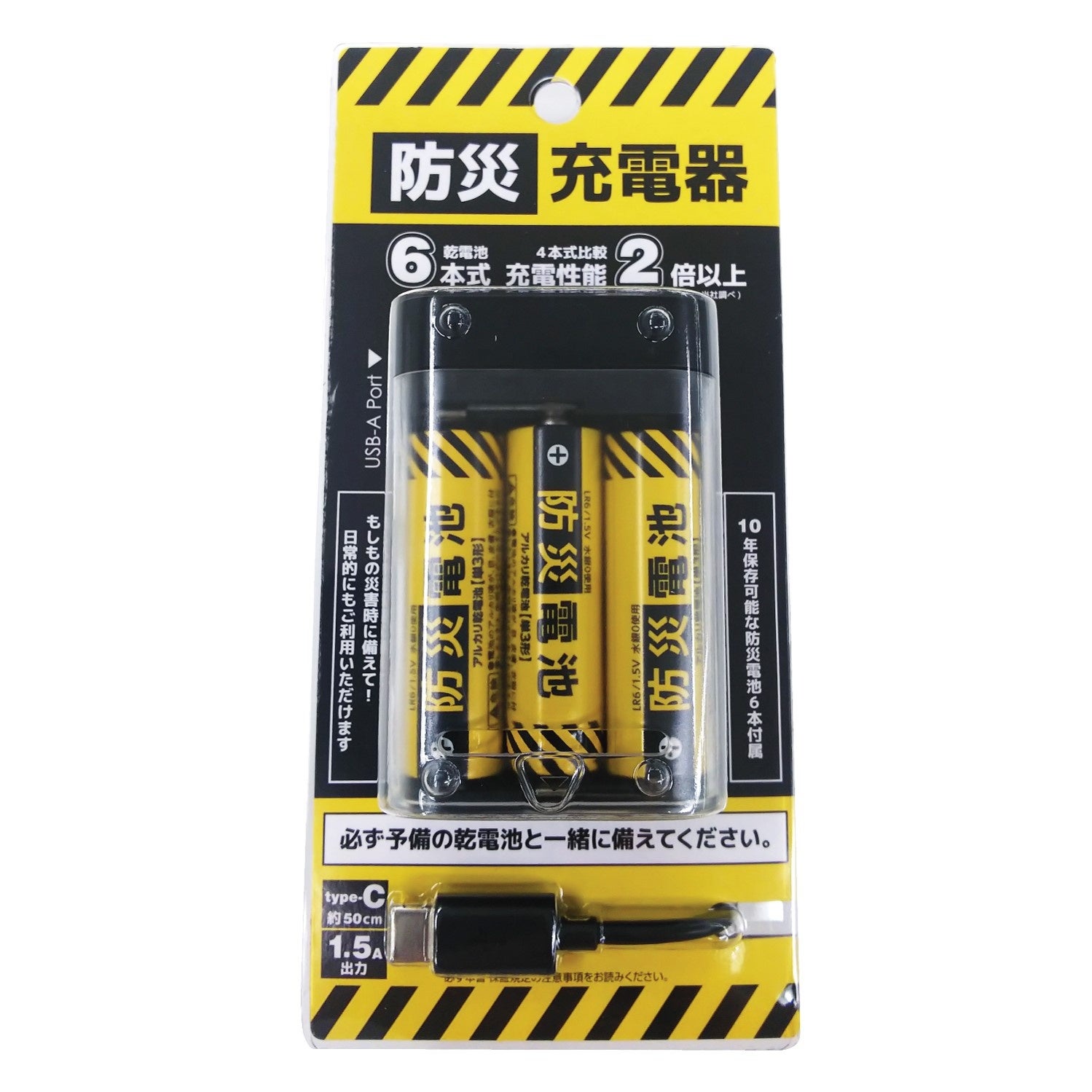 ① 防災電池(単三)6本、USB-typeCケーブルが付属。