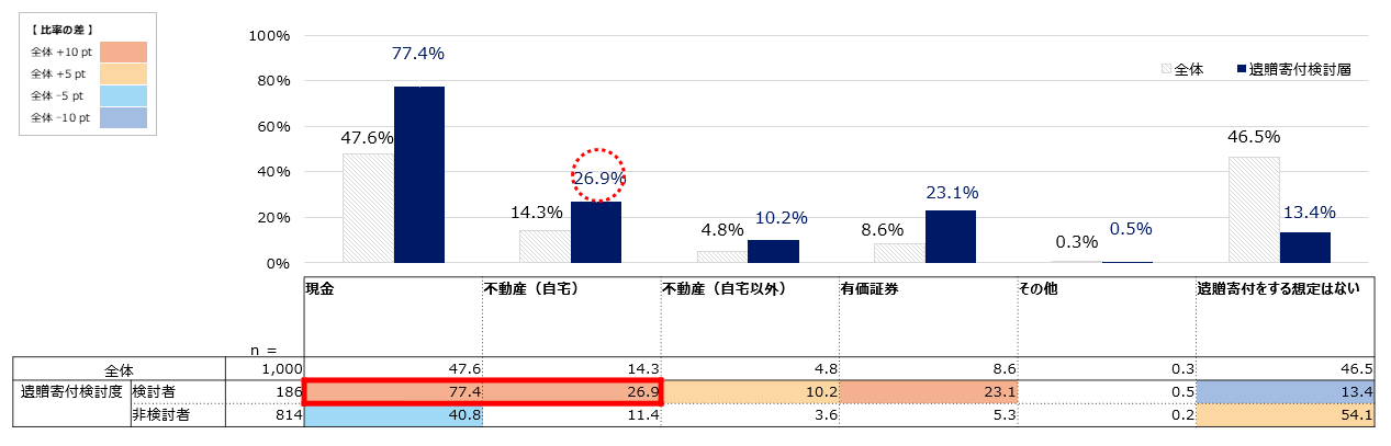 また、保有財産が5,000万円~1億円未満の人で「不動産(自宅)」を選んだ人は27.1%、1億円以上の人は31.3%となり、保有財産が多くなるにつれ、「自宅以外」を選んだ人も含め、不動産の遺贈寄付を希望する傾向が高いと言えます。