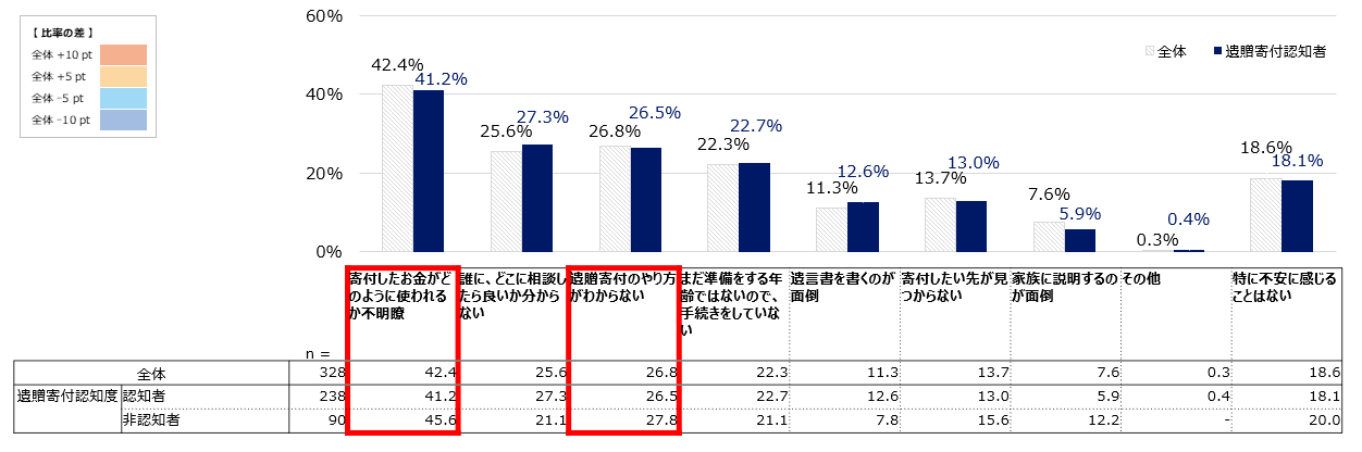 遺贈寄付を実施する上で懸念点となっているのが、遺贈寄付の認知有無関わらず「寄付の使途が不明瞭」「遺贈寄付のやり方が分からない」という点が大きな理由となっています。