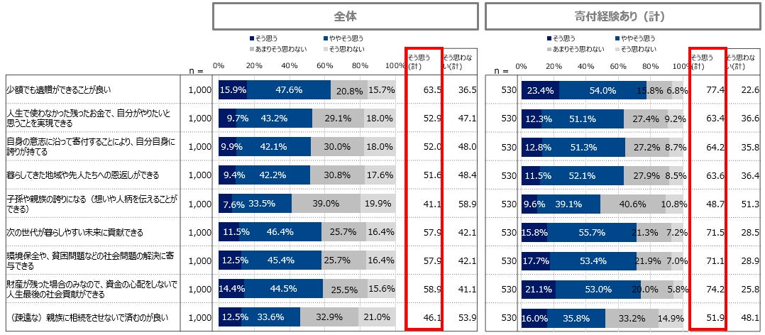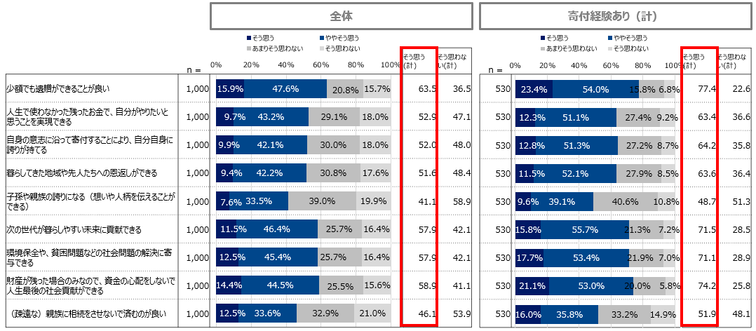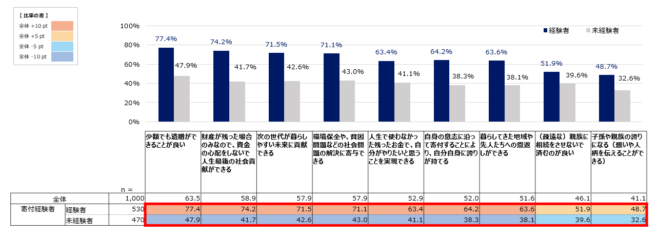 また寄付経験者は、全ての項目において、未経験者を上回り遺贈寄付の特長を評価する傾向であり、寄付未経験者に比べて、寄付経験者の方が遺贈寄付を好意的に捉える傾向にあることが窺えます。