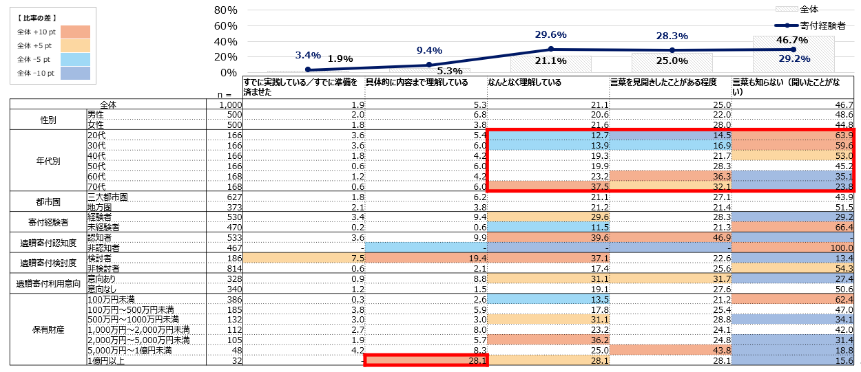 遺贈寄付について理解している人の割合は28.3%。年代別では、年代が上がるにつれて認知・理解度も上昇傾向にあります。具体的に内容まで理解している層の割合は低い一方で、保有財産1億円以上の富裕層は内容まで理解している割合が他より明らかに高い結果となりました。