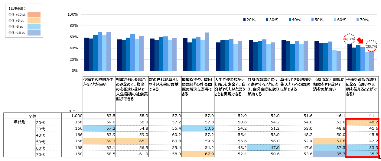 遺贈寄付に対して「子孫や親族の誇りになる(想いや人柄を伝えることができる)」と考える割合が、年代に応じて減少傾向にある等、年代間でも遺贈寄付に対する印象・評価にギャップがあった。