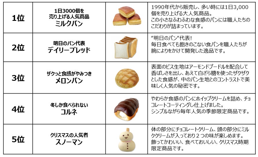 1位2位は不動のミルクパン、デイリーブレッドでしたが、寒い冬のこの時期にしか食べられない毎年人気の「コルネ」と、12月1カ月間限定販売で、見た目がかわいいと人気の「スノーマン」がランクインしました。
