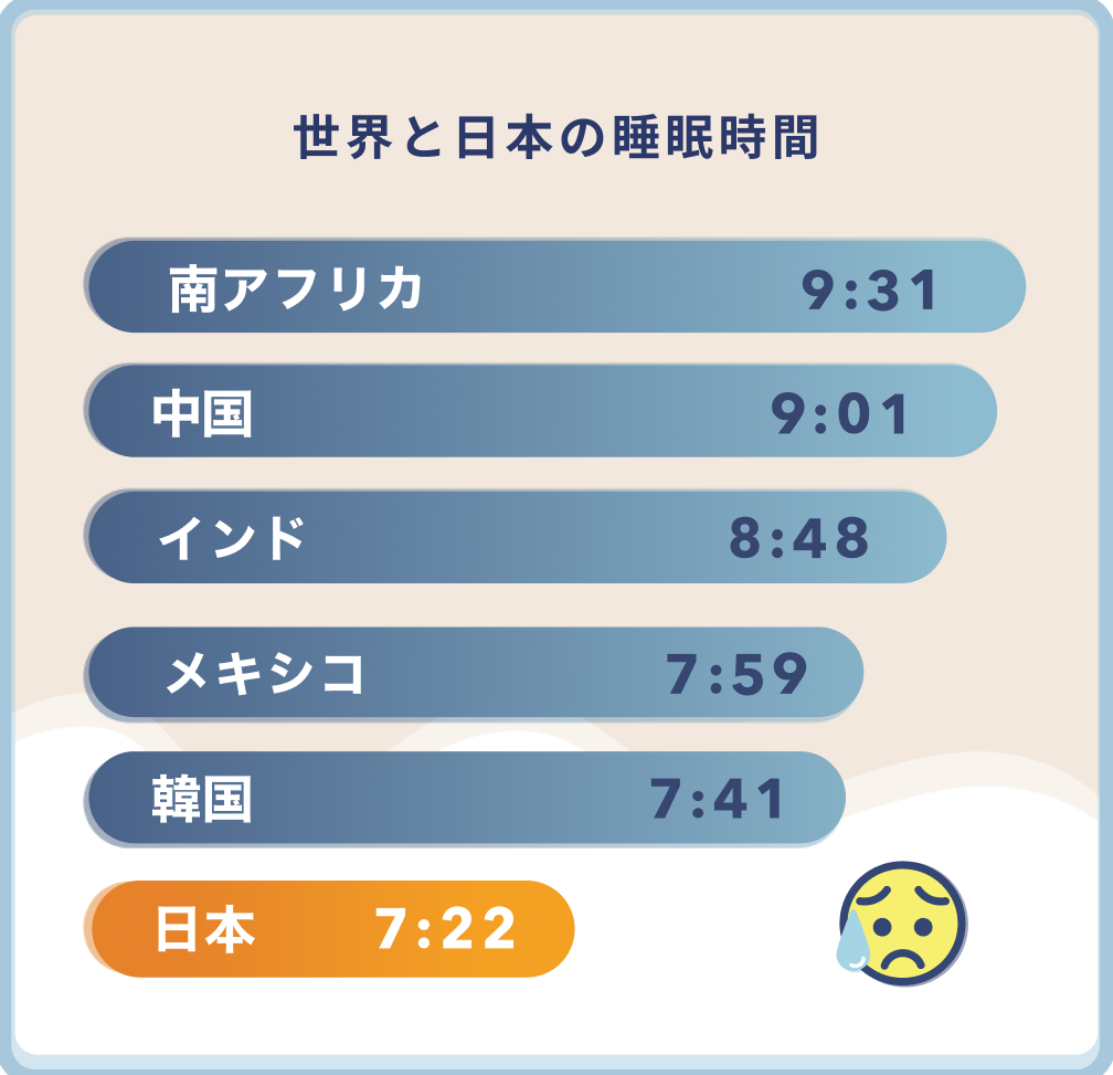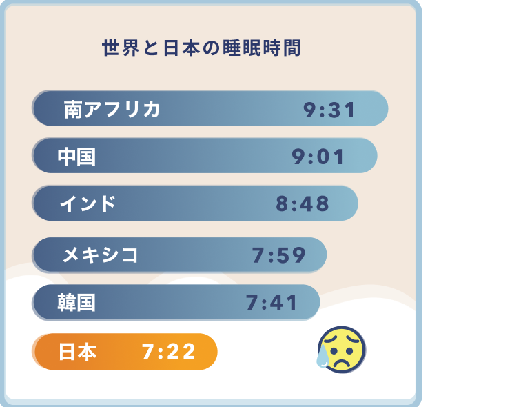 日本人の睡眠時間は世界の先進国の中でも短いことが報告されています。(※) また、日々のストレスや生活環境の変化等の理由から、「寝つきが悪い」や「寝ても疲れがとれない」といった睡眠に関する何かしらの悩みを抱えている人が多いことが自社調査によりわかりました。睡眠は心身の健康に大きく関与するため、こういった睡眠に関する悩みを抱えるユーザーをサポートすることで一人でも多くの人の笑顔を増やしたいという想いから開発しました。