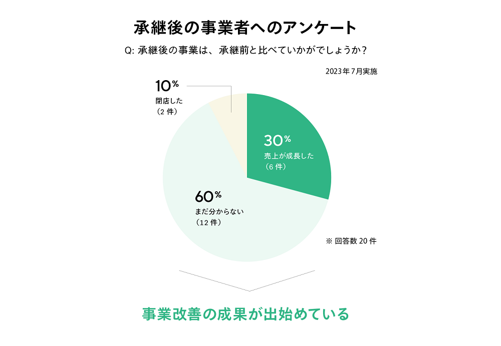 7月に実施した承継後の事業者へのアンケート結果では、承継後に売上が成長したと答えた企業が30%(6件)、まだ分からない60%(12件)、閉店した10%(2件)となりました。事業承継後、事業改善の成果が生まれた事業者が出始めており、初期的なインパクトが確認されています。