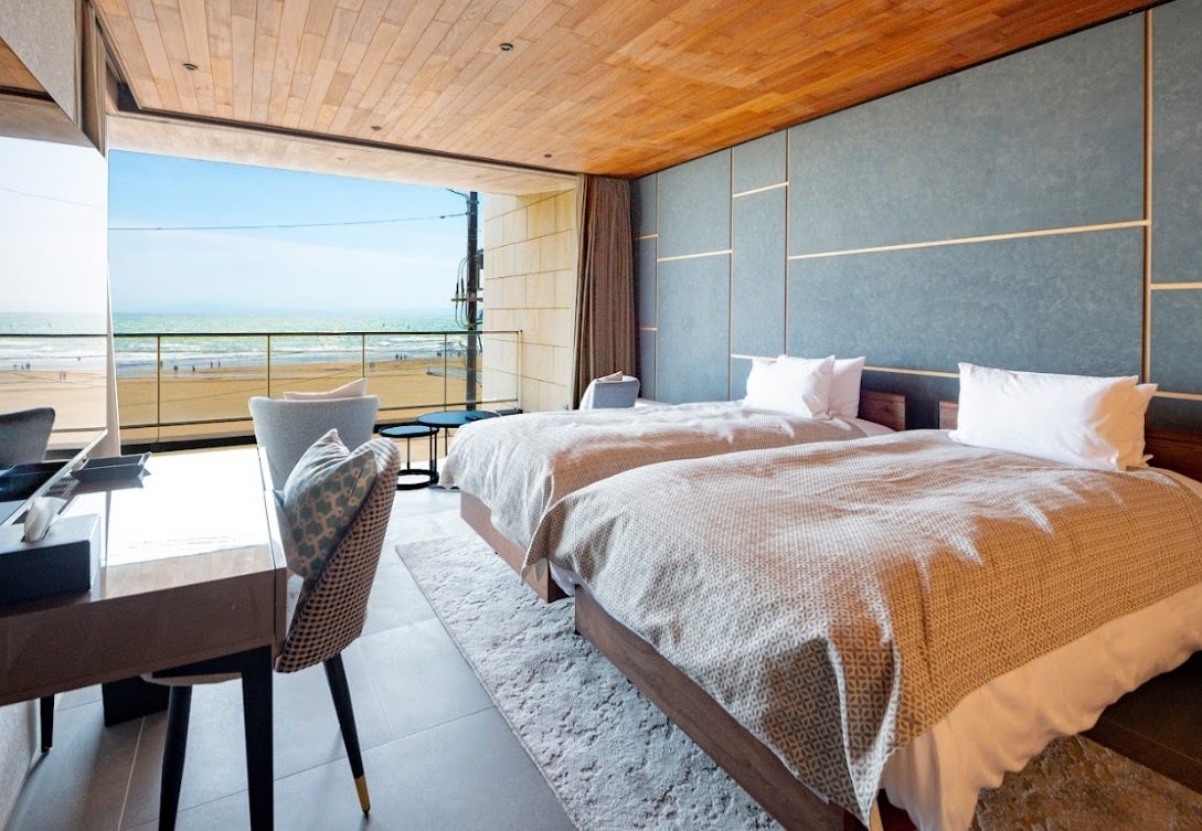 建物の目の前には、美しい砂浜と遠浅の綺麗な海が特徴的な由比ヶ浜海岸・材木座海岸が広がり、朝から夜まで海を感じられる優雅な非日常を体感できます。