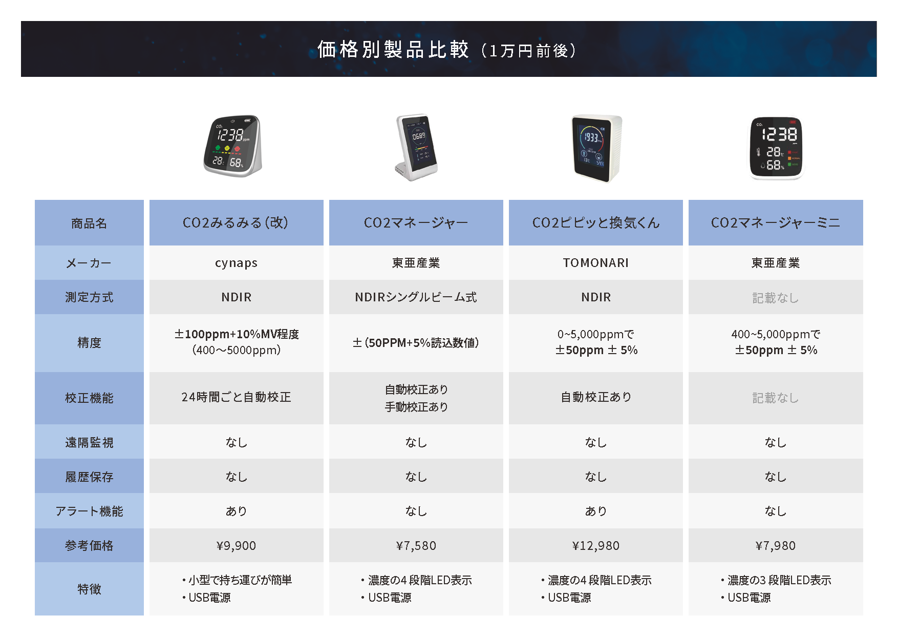 感染症対策で二酸化炭素濃度計のご購入を検討されている方向けに様々な二酸化炭素濃度計の計測精度を価格別にまとめたコンテンツです。