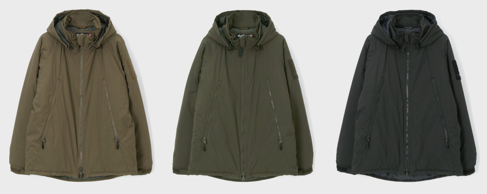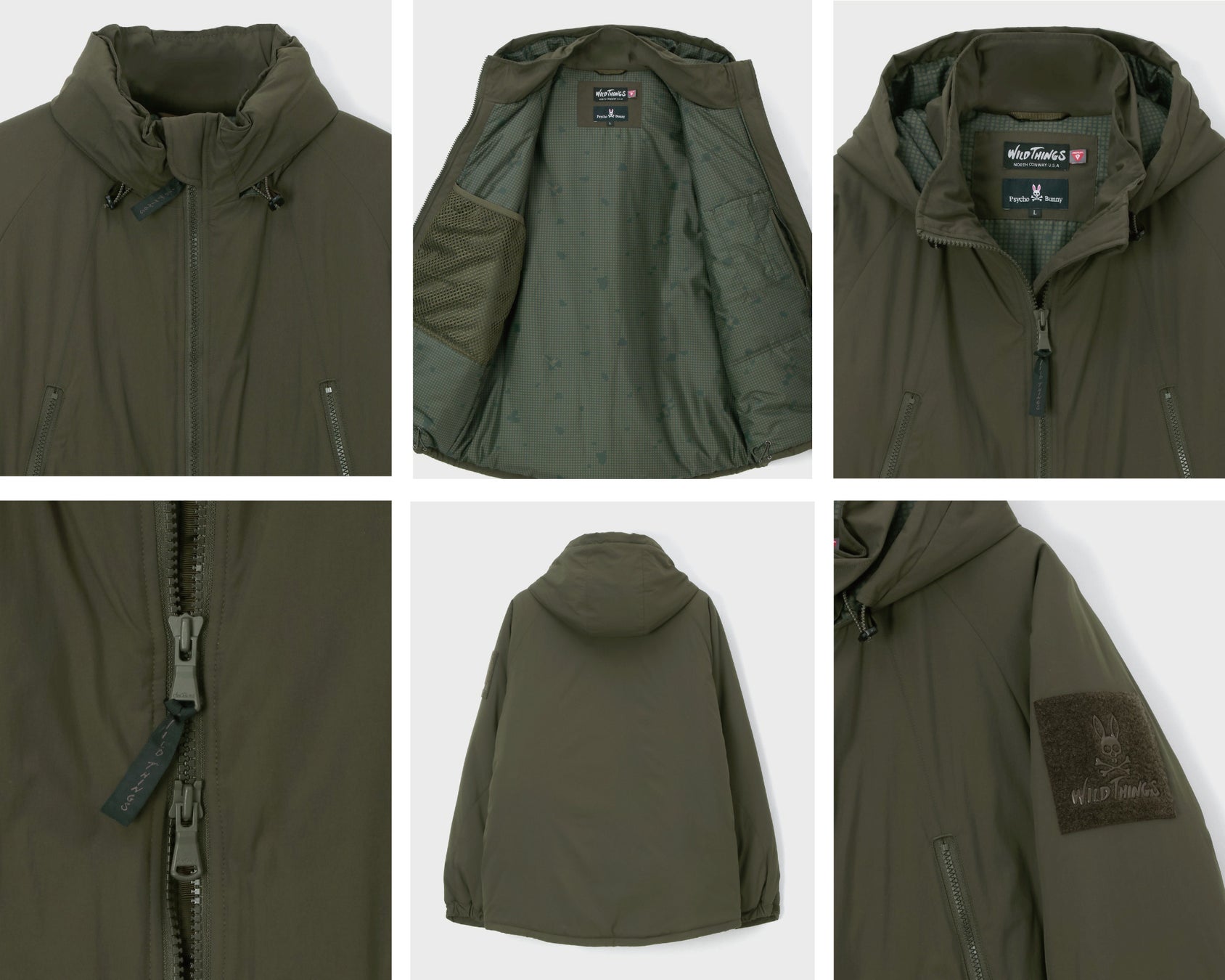 今回“サイコバニー”は、その無駄なく削ぎ落されたデザインが洗練された印象を与え、飽きずに着られること間違いなしのミリタリーギアの名作「ハッピージャケット」と、その程よい丸みのあるシルエットと必要最低限のアウトドア機能を加えることで、タウンユースで活躍する「パディングキャップ」を“ワイルドシングス”とのコラボアイテムにチョイスいたしました。