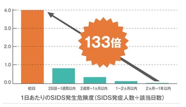 近年の研究では、保育施設の預かり初日や、帰省や旅先等で睡眠環境に変化があった際、SIDSの発生が高まることが報告されています。さらに預かり初めの1週間に3分の1が発症、そのうち2分の1が預かり初日にSIDS発症の危険度が高いとされたアメリカの報告と近似していることが分かりました。