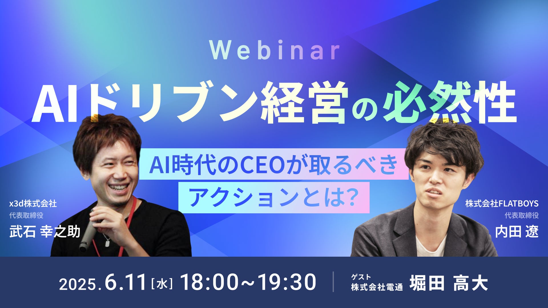 株式会社FLATBOYS(本社:東京都、代表取締役 内田遼)は、x3d株式会社と共催で、経営層・事業責任者向け無料ウェビナー 「AIドリブン経営の必然性 〜AI時代のCEOが取るべきアクションとは?」 を 2025年 6月 11日(水)18:00 よりオンライン配信いたします。