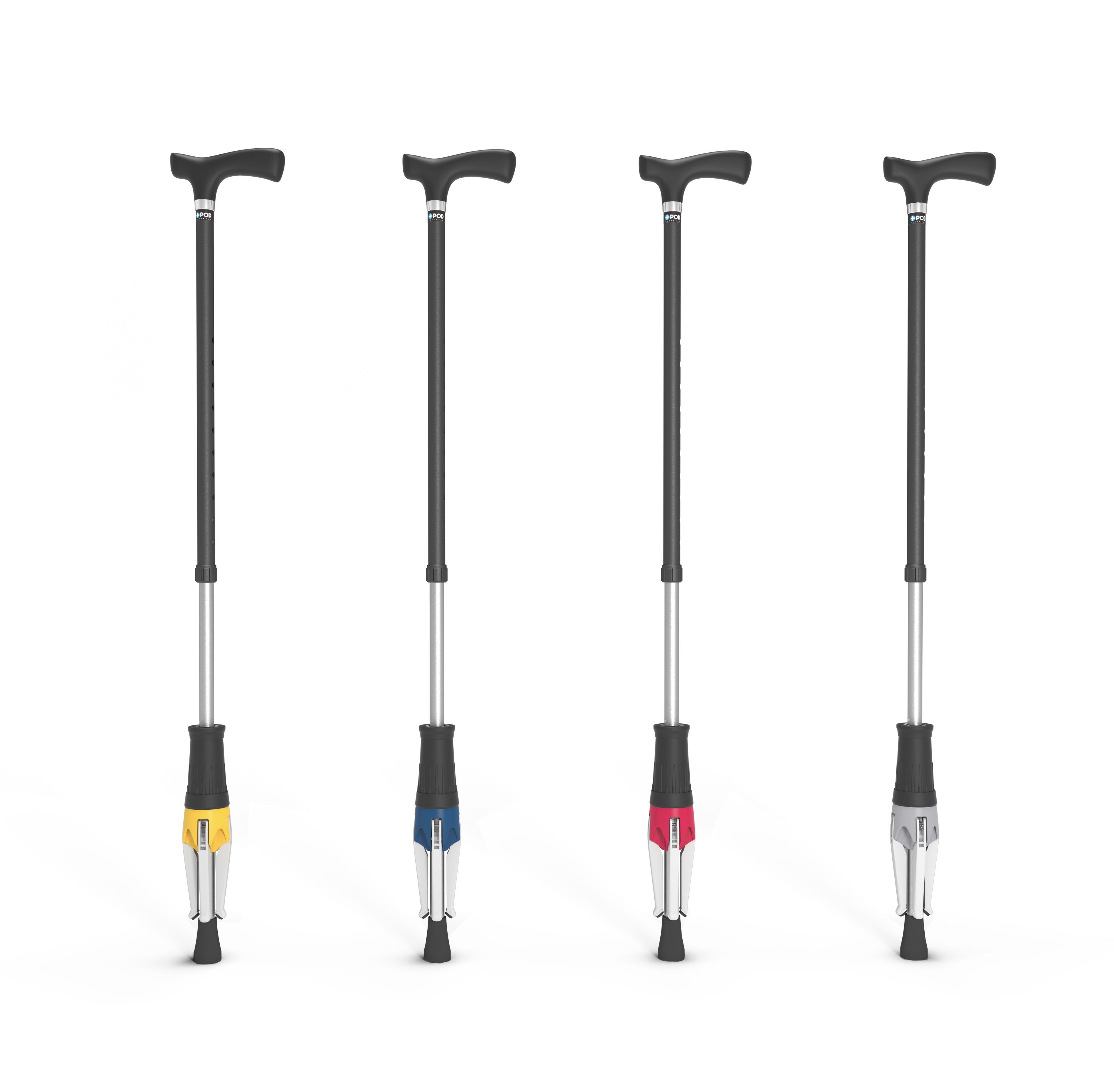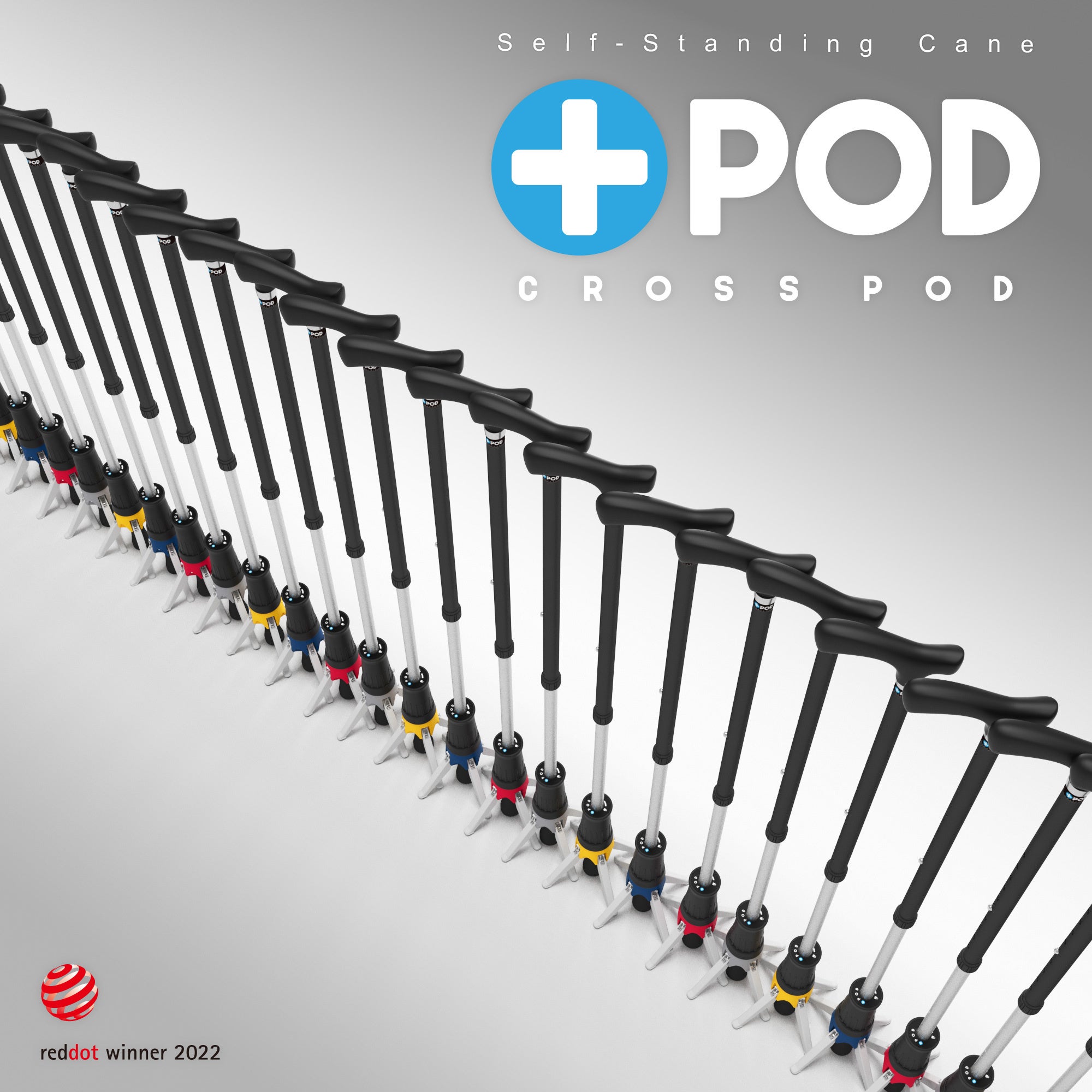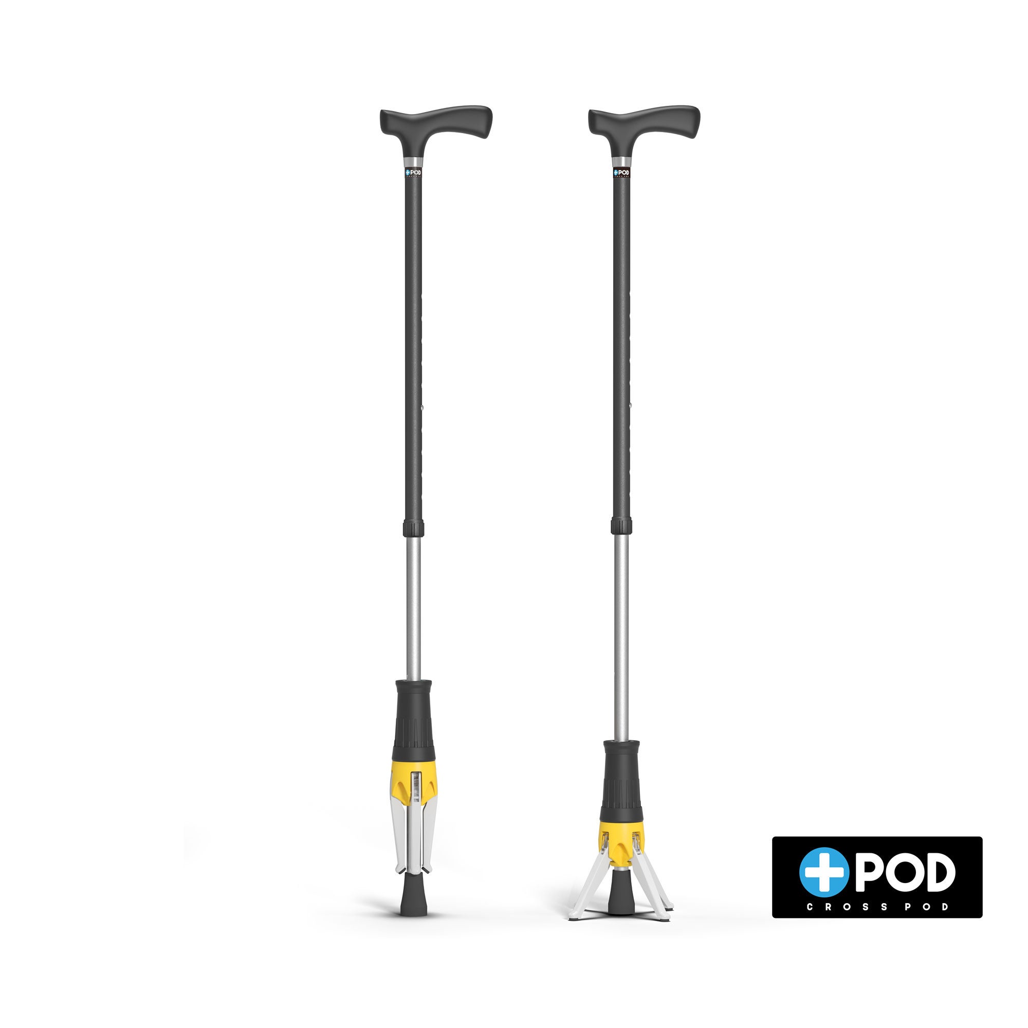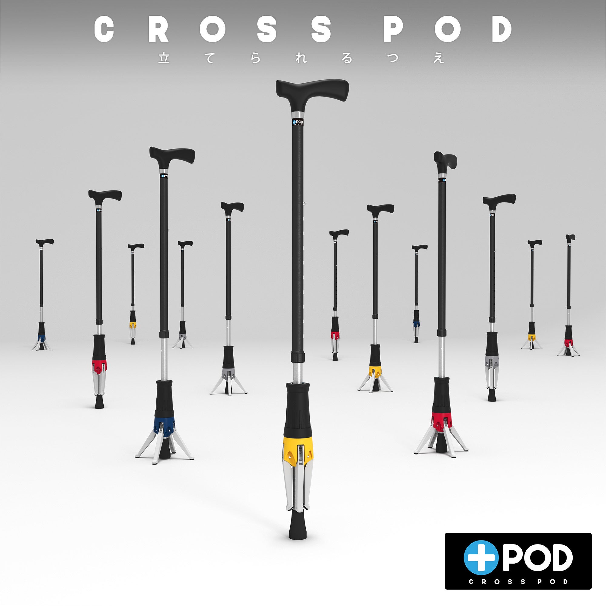 クロスポッド (CrossPOD)は”1点つえ”を、どこでも安定して立てられる様にした製品です。歩行時は1点杖として違和感なく使うことができ、置いておきたい時には、開閉式の脚を開くことで、どこにでも立てられます。杖先端部の脚開閉ユニットは小型、軽量(つえ総重量360g)で、開閉操作も簡単です。