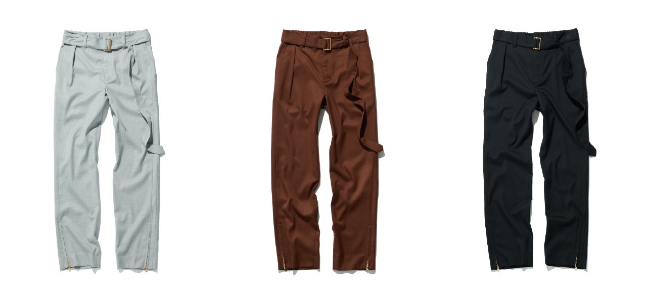 サイドを側章のように切り替えたカッティングに腰回りのインタックを入れ少しクラシックな雰囲気にしながら、裾に GOLD ZIP をアクセントで配置する 事でモダン仕立てた 1 着。裾の ZIP を開けてフレアーのシルエットにしたり閉めてテーパードにしたりと 2 通りの履き方が愉しめるのも特徴。