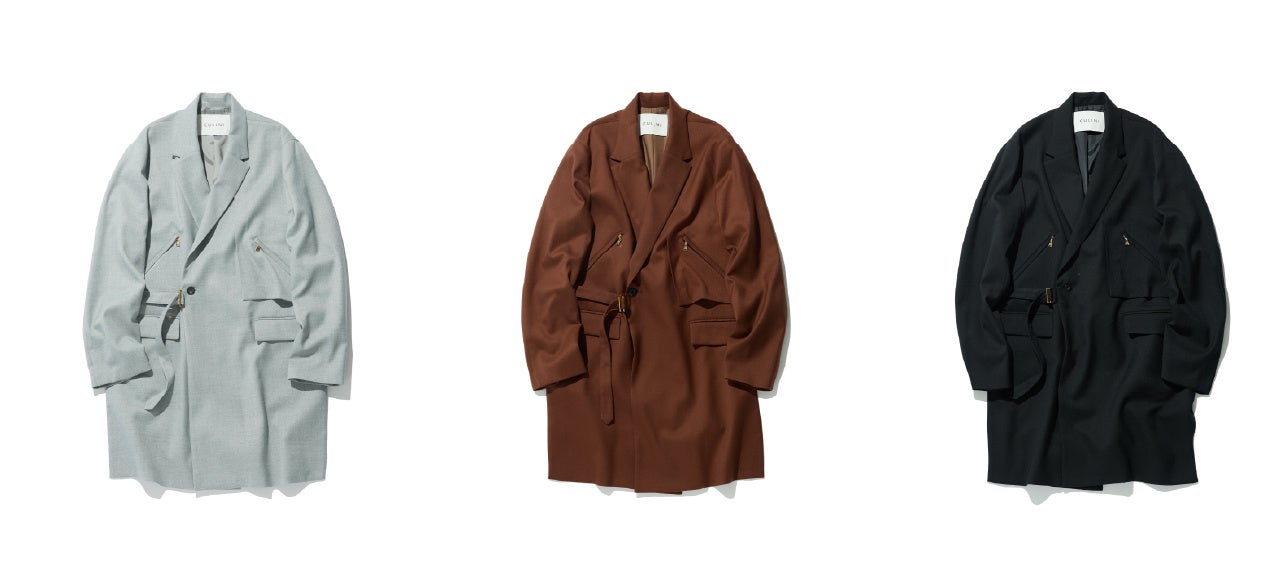 レイヤードされたフラシ布にゴールド ZIP ポケットを配置。さらにタイロッケンベルトでウエストにも変化を付けたデザインを余すと事無く詰め込んだロ ングジャケット。レイヤードされた生地やウエストベルトが揺れる事で出る生地の空気感は着た人にしかわからない特別な高揚を感じられる 1 着。