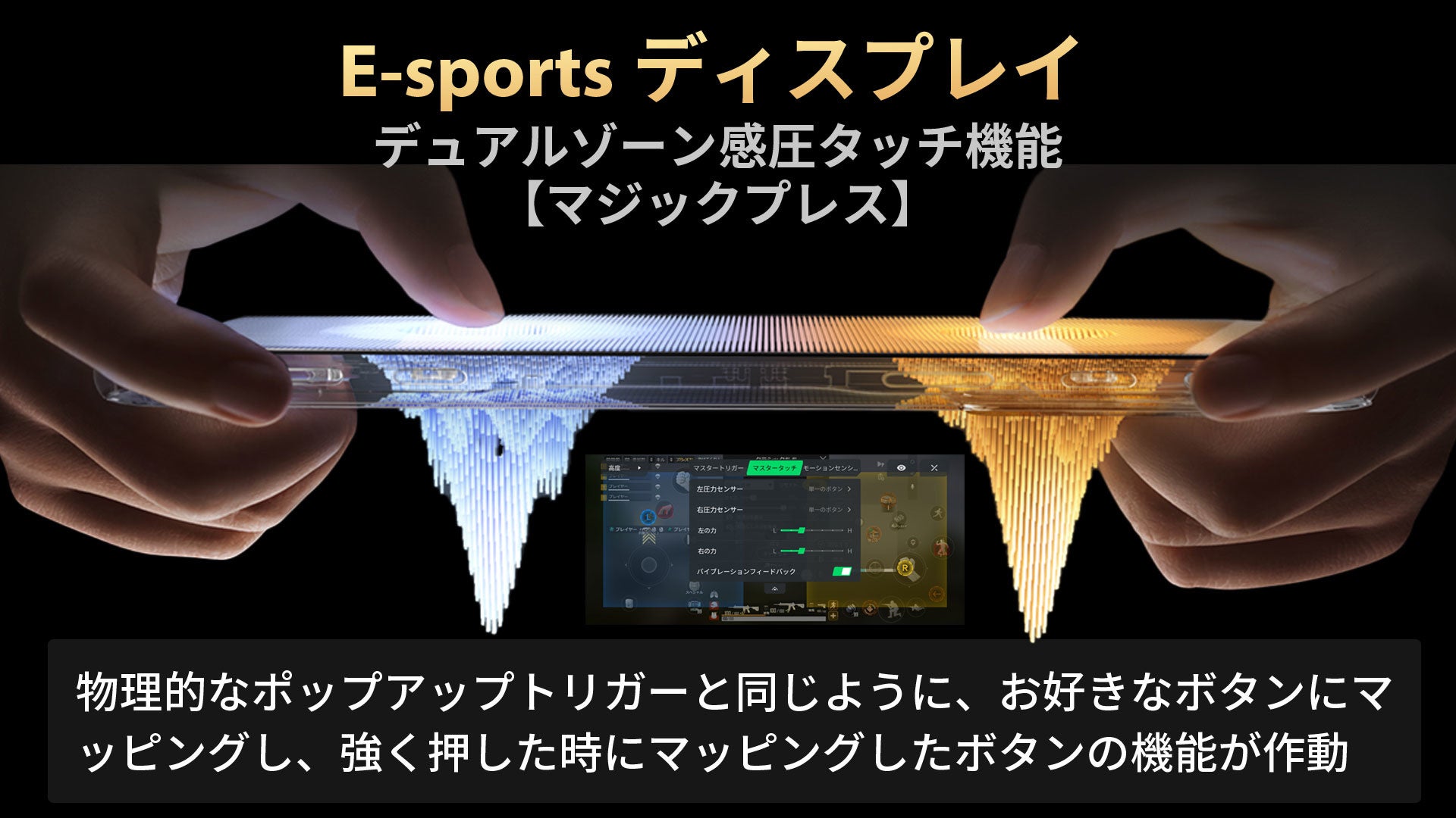 この世界最先端技術により、物理的なポップアップトリガーと同じように、お好きなボタンにマッピングし、強く押した時にマッピングしたボタンの機能が作動します。例えばジャンプしながら撃つ、移動しながら撃つなどが容易に実現します。また、最大7レベルの幅広いプレス感度をサポートしているため、どんなタイプのゲームでも正確に制御できます。 更にミスタッチ防止も改善され、最高の感圧体験を実現。この感圧ディスプレイにより、最も競争の激しいゲームでも正確な動きで対応できます。