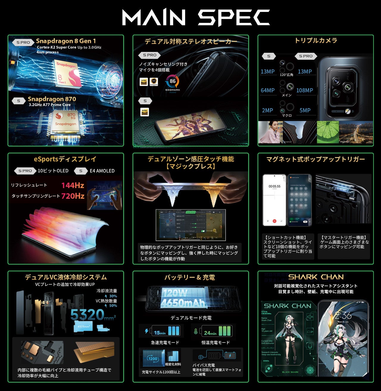 ・Qualcomm®Snapdragon™8Gen1 ・5G対応SIMフリー端末 ・LPDDR5+UFS3.1 ・120W急速充電 ・4650mAhバッテリー ・デュアルモード充電 ・バイパス充電 ・デュアル対称ステレオスピーカー ・デュアルVC液体冷却システム ・10ビットOLEDディスプレイ ・感圧タッチ機能マジックプレス ・リフレッシュレート144Hz ・タッチサンプリングレート720Hz ・ゲームシステム:Shark Space 4.0 |