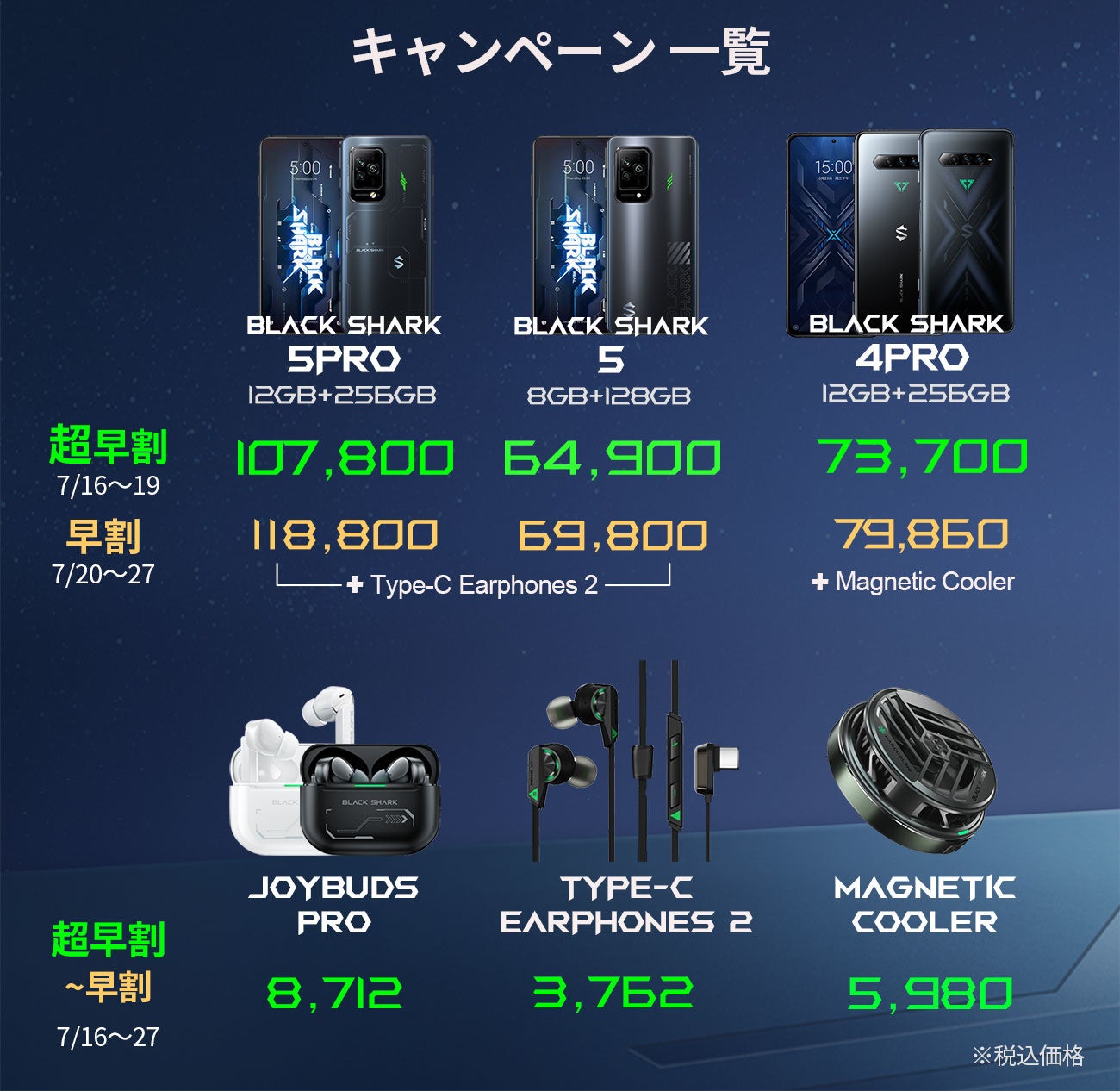 ・Black Shark 5(8GB+128GB/ブラック):69,800円(税込)・Black Shark 5 Pro(12GB+256GB/ブラック):118,800円(税込)