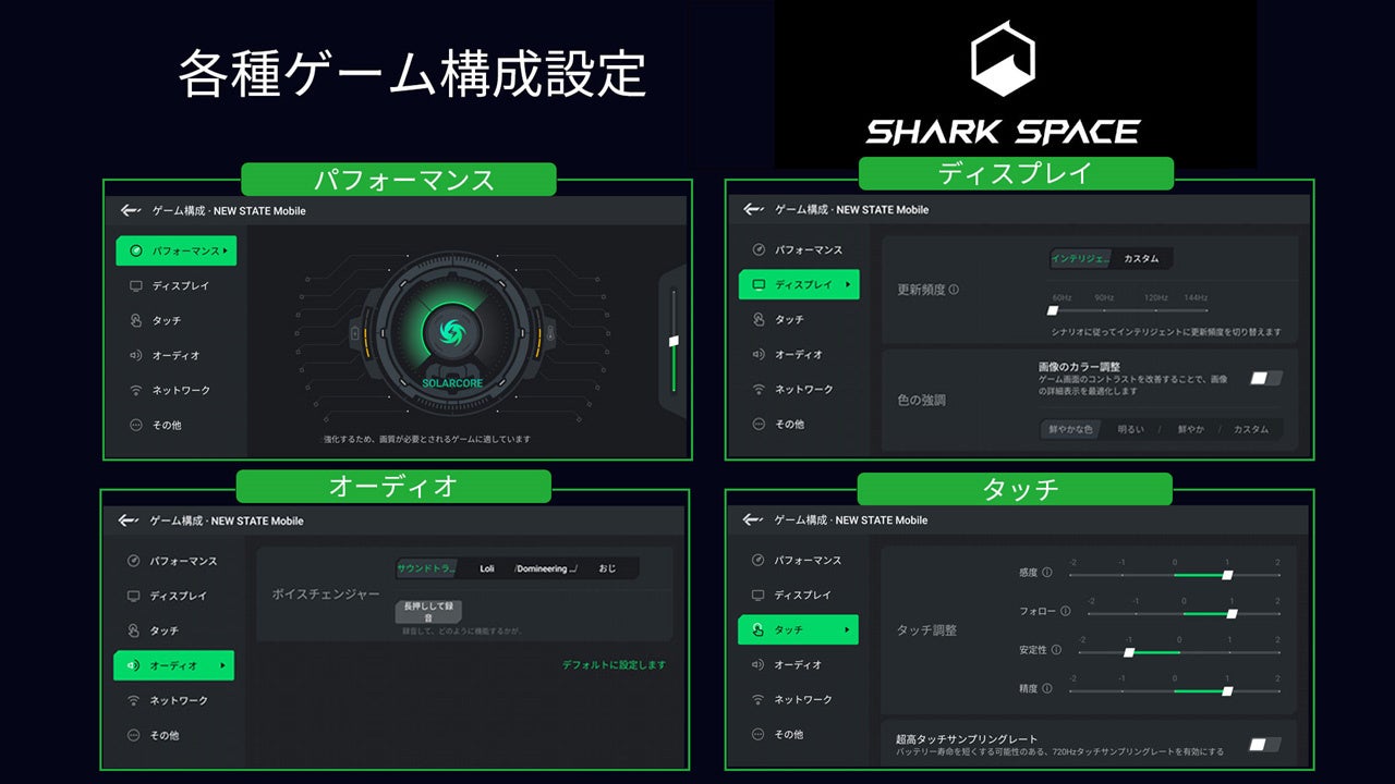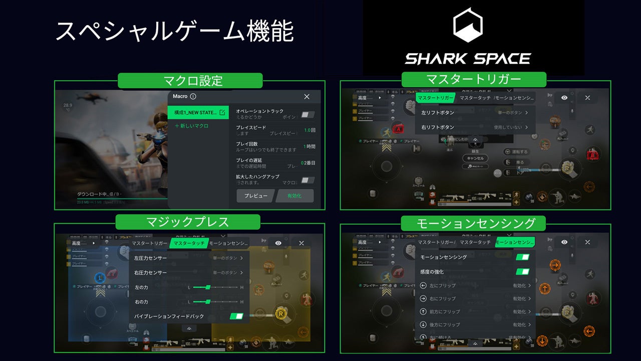 Shark Space を使用すると、ユーザーは、ゲーム中への没入感を損なうことなく、ネットワークステータス、パフォーマンス、サイレント機能、マジックプレス設定、およびその他の機能をすばやく調整できます。 ユーザーは、ゲームスタジオでダイブモードを選択することで、通知や着信などの外部からの干渉を排除することもできます。更に60秒まで遡って録画が可能なシャークタイム機能やマジックプレス、マクロ設定、モーションセンシング設定、様々なゲーム構成設定が可能です。まさにBlack Shark社オリジナルゲーム機能です。