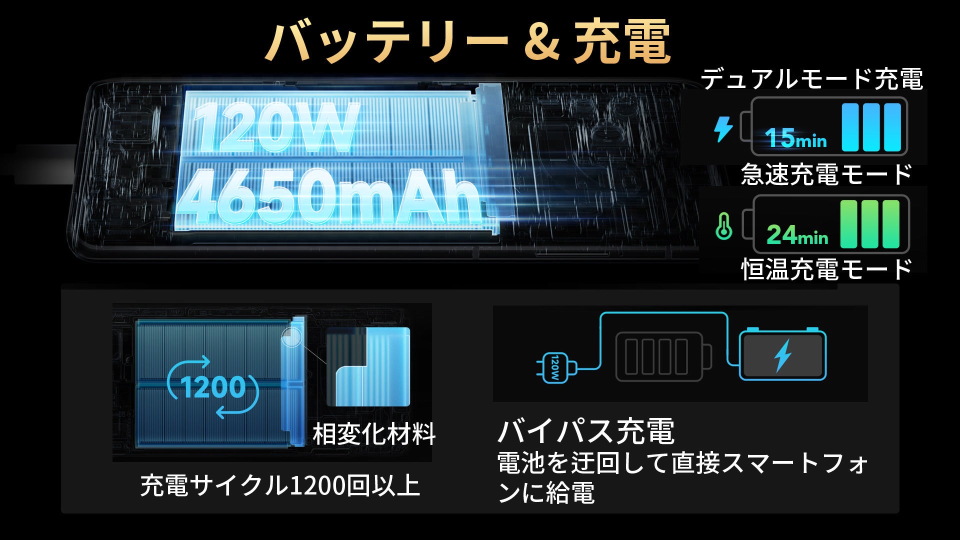 超大容量4650mAhのダブルセルバッテリーを積んでいます。 従来の15分で充満電の急速充電モードにプラスした熱放散と充電速度のバランスを取りながら充電する恒温モードは24分で充満電可能です。更に充電しながらゲームをしたいユーザーの為にBlack Shark 5シリーズから新しく電池を迂回して直接スマートフォンに給電するバイパス充電システムが搭載されました。電池の消耗が減り、放熱問題も解決されました。 バッテリーは温度をほとんど変化させることなく熱を吸収し、温度上昇にかかる時間を遅らせる効果がある相変化材料の使用で充電時の発熱問題を解決しました。1200回以上循環充電を可能にしたバッテリーは業界基準を大きく上回り、電池の寿命を大きく延ばしました。まさにゲーミングスマホ業界にバッテリー革命を起こしました。