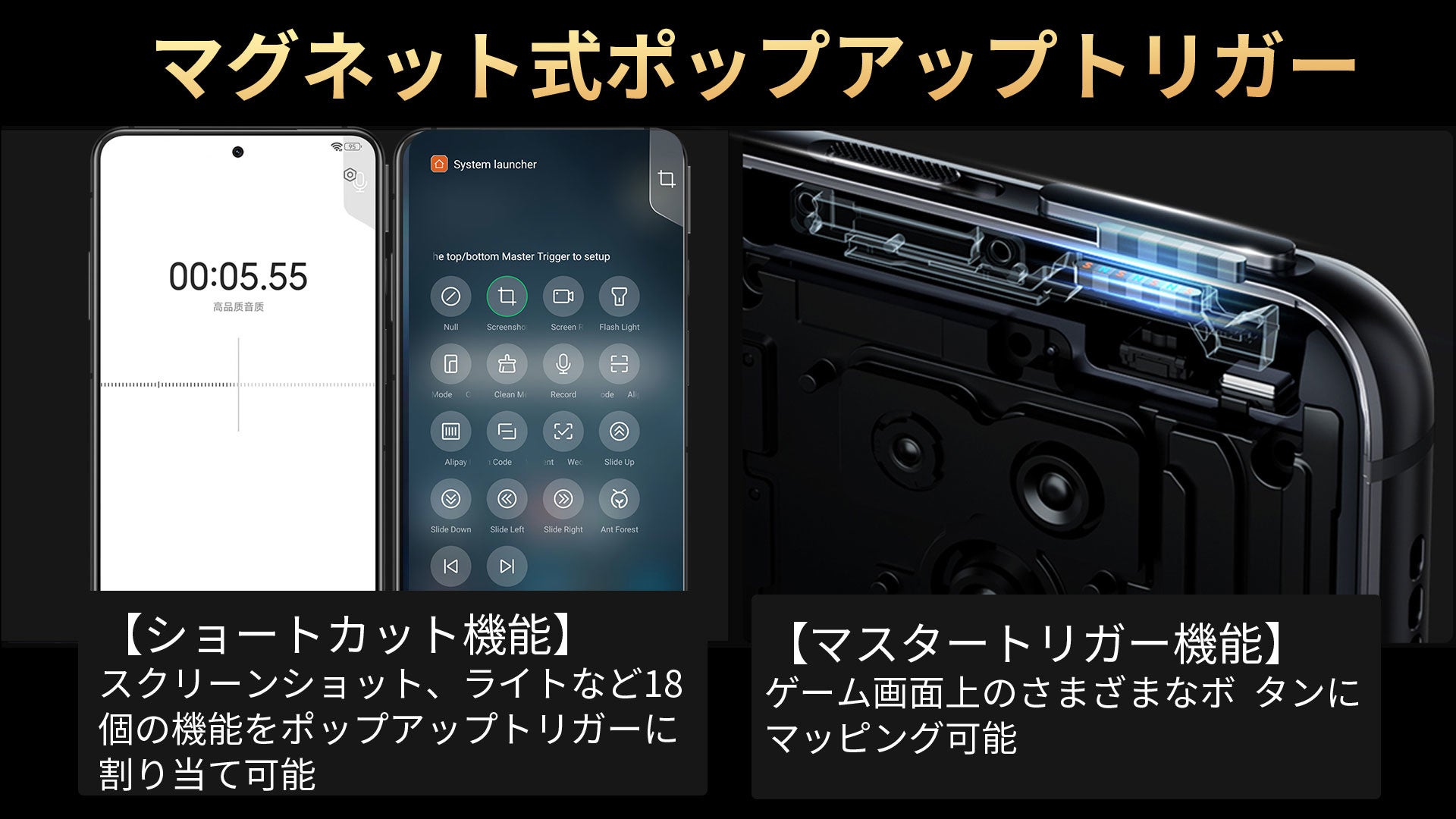 両モデルとも物理LRボタン、マグネット式ポップアップトリガーを搭載しています。Black Shark革新的なマグネットリフトテクノロジーにより超応答性のトリガーボタンは、競争の激しいゲームで正確且つカスタマイズ可能。しかも軽いタッチで素早く反応できる操作感度抜群なトリガーです。ゲーム画面上のさまざまなボタンにマッピングでき、画面操作と同時に割り当てしたボタンの操作が可能です。更にショートカット機能もあり、スクリーンショット、ライトなど18個の機能をポップアップトリガーに割り当てることが可能です。ボタンを押すだけで割り当てられた機能が利用できるため、ゲーム以外の日常使いでも、とても便利です。使用していない時は、本体サイドに収納できるので、決して邪魔になりません。