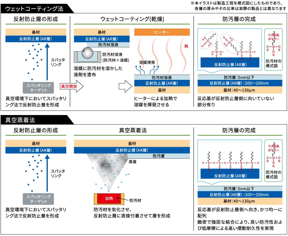 既存の製造設備に真空蒸着装置を導入し、量産を開始。2023年4月に稼働する新しい製造装置では反射防止層と防汚層を一貫して高効率に成膜可能。