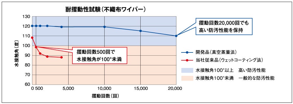 初期の水接触角は120°を実現。不織布ワイパーを用いた摺動性試験において、摺動回数が20,000回以上を超えても水接触角110°以上を維持。