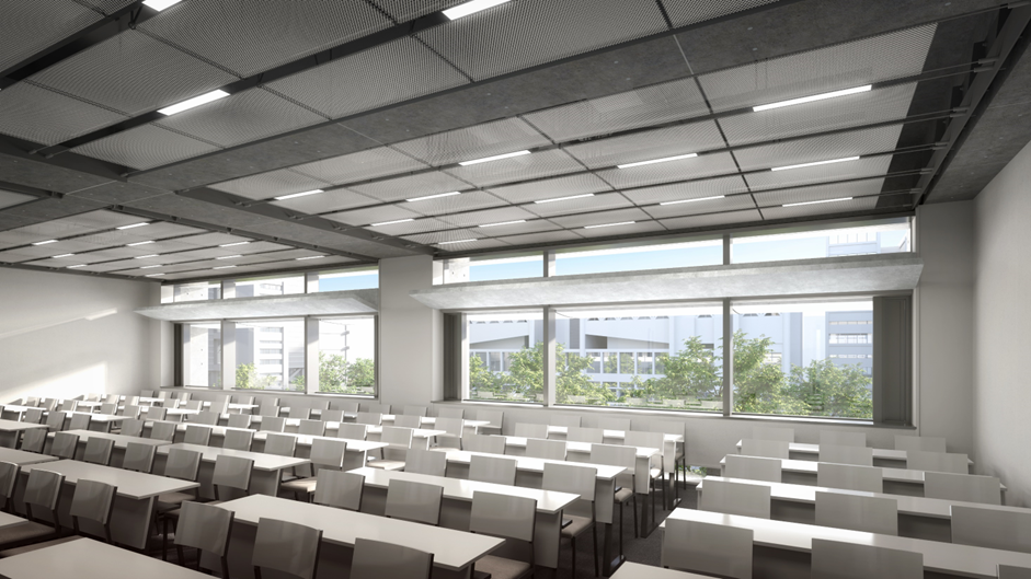 新53・54号館に位置する新教室です。 既存52号館にある架構を見せる意匠を継承しつつ、自然光を取り入れながら日射遮蔽のための庇を設け、快適な教室環境を整備します。
