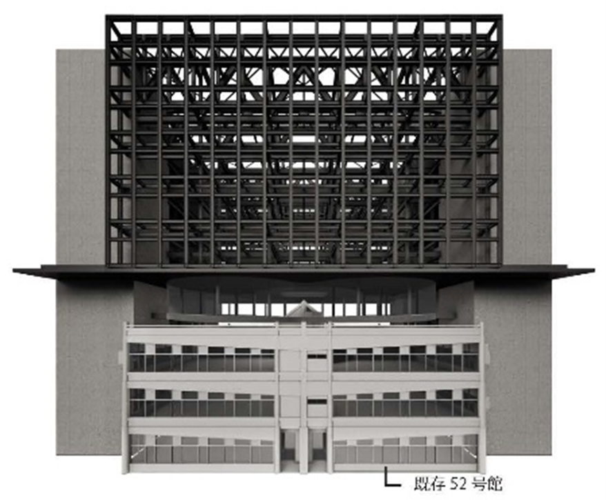 既存52号館を跨ぐように新52号館を増築します。構造は既存52号館を挟んで立つ新設コアを結ぶ最上部のハンガートラスから各階床を吊り下げる架構形式とし既存52号館に荷重をかけないダイナミックな構造を用いて既存52号館自体をヘリテイジとして残す計画です。