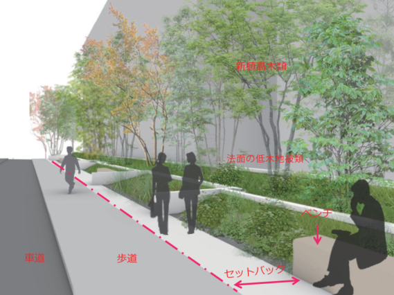 キャンパス南側(コズミック通り)に向けて、植栽、ベンチ、傾斜面の緑地を設けることで周辺に対して圧迫感を軽減します。地域の在来種を中心に歴史的に大久保地区に所縁のあるツツジ類などの園芸種も取り入れる予定です。現在の敷地境界から約1mセットバックして、既存の歩道と合わせた安全な歩行空間を確保します。また、すれ違いスペースも兼ねるベンチのある滞留スペースを設けることで、地域に親しみある歩行空間を提供します。