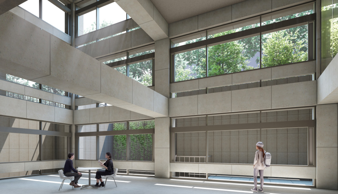 日本建築学会賞を受賞している既存の52号館を生きた教材:ヘリテイジとして継承するため完全に保存し、これを跨ぐように新52号館を建設します。