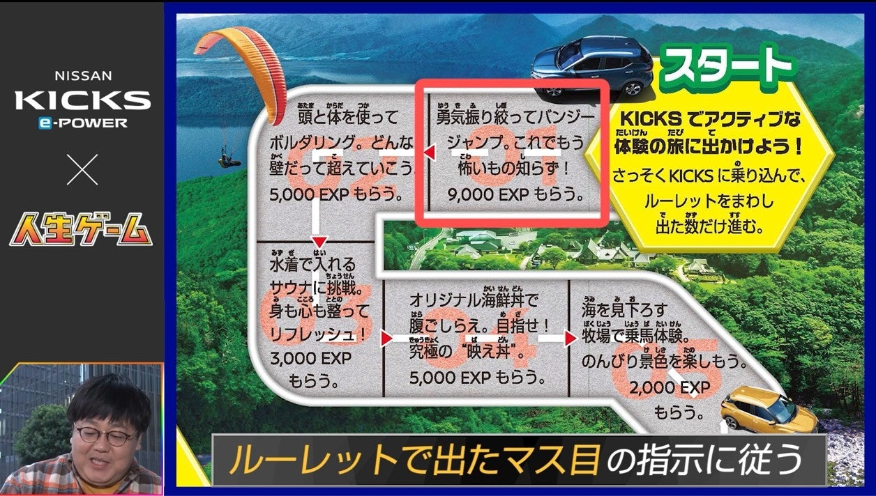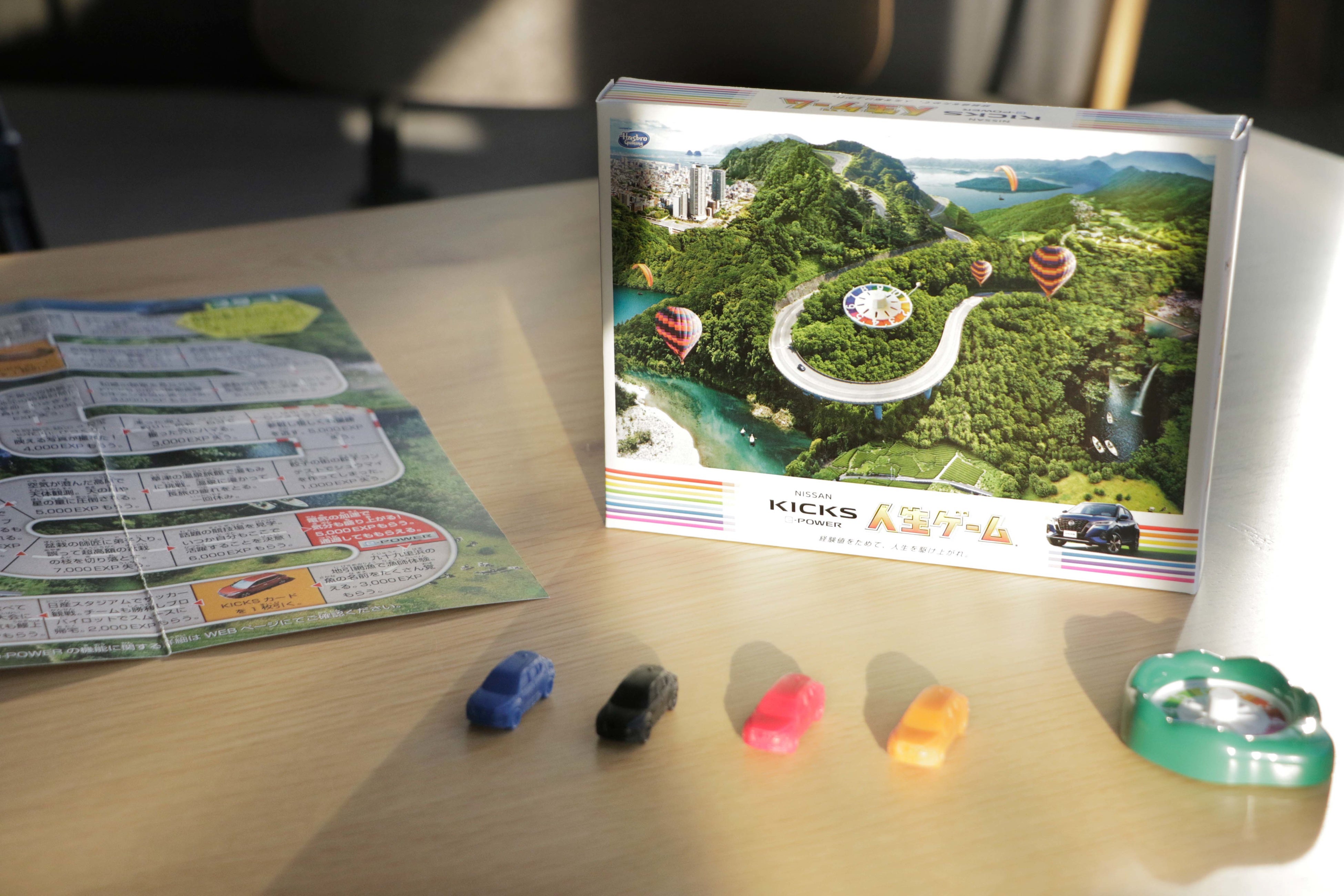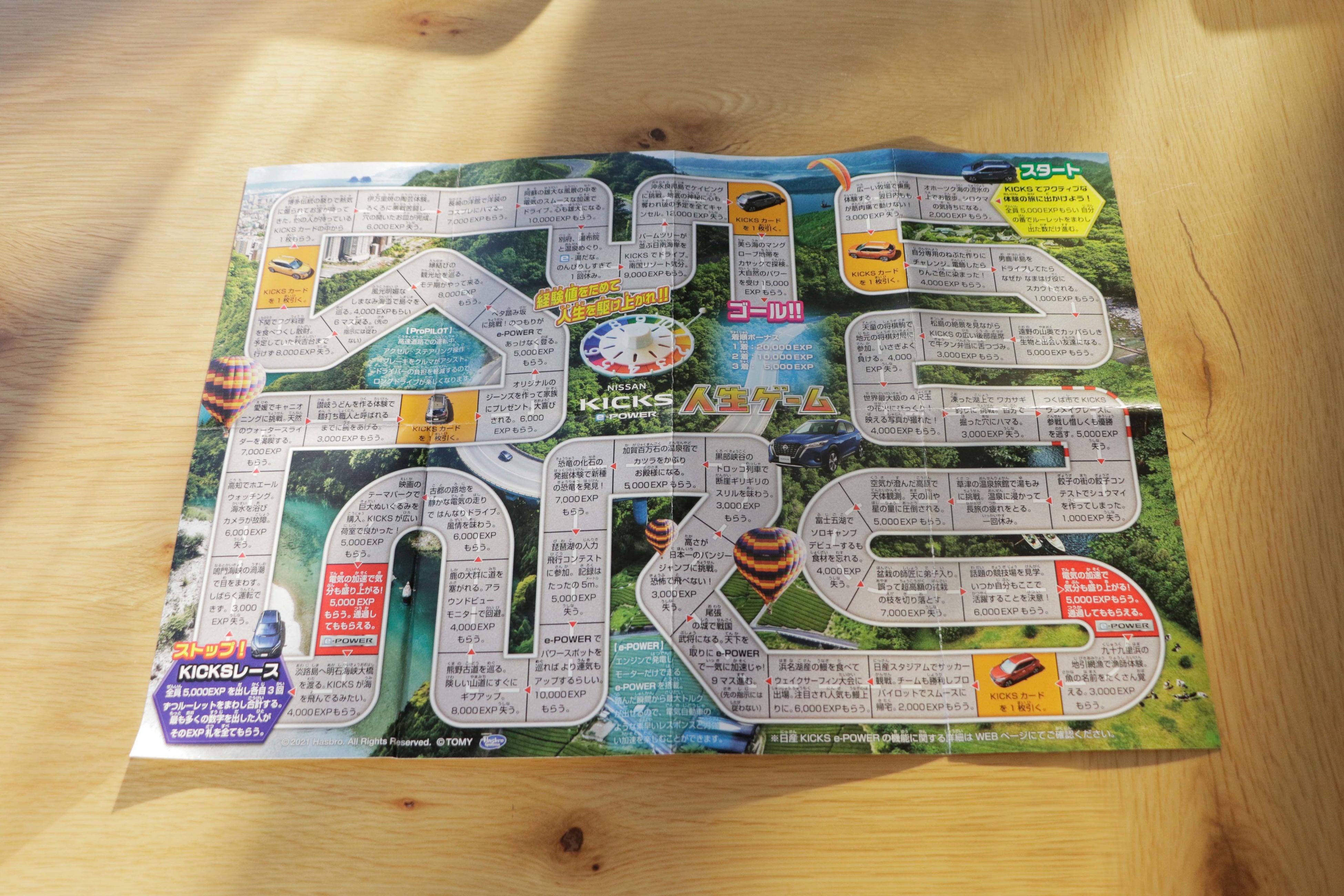 「NISSAN KICKS e-POWER 人生ゲーム-全国アクティブ版-」は、全国を舞台にしたオリジナルの人生ゲームで、マス目に書かれているのは、各地域ならではのアクティビティ、観光スポット、時にはキックス e-POWERによる電気の加速など、「リアル人生ゲーム」と同様、お金ではなく人生を豊かにする経験値(EXP)を貯めて合計数を競い合う、一味違ったオリジナルの人生ゲームとなっています。