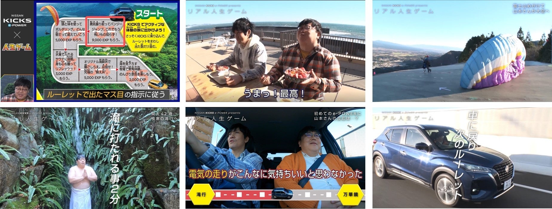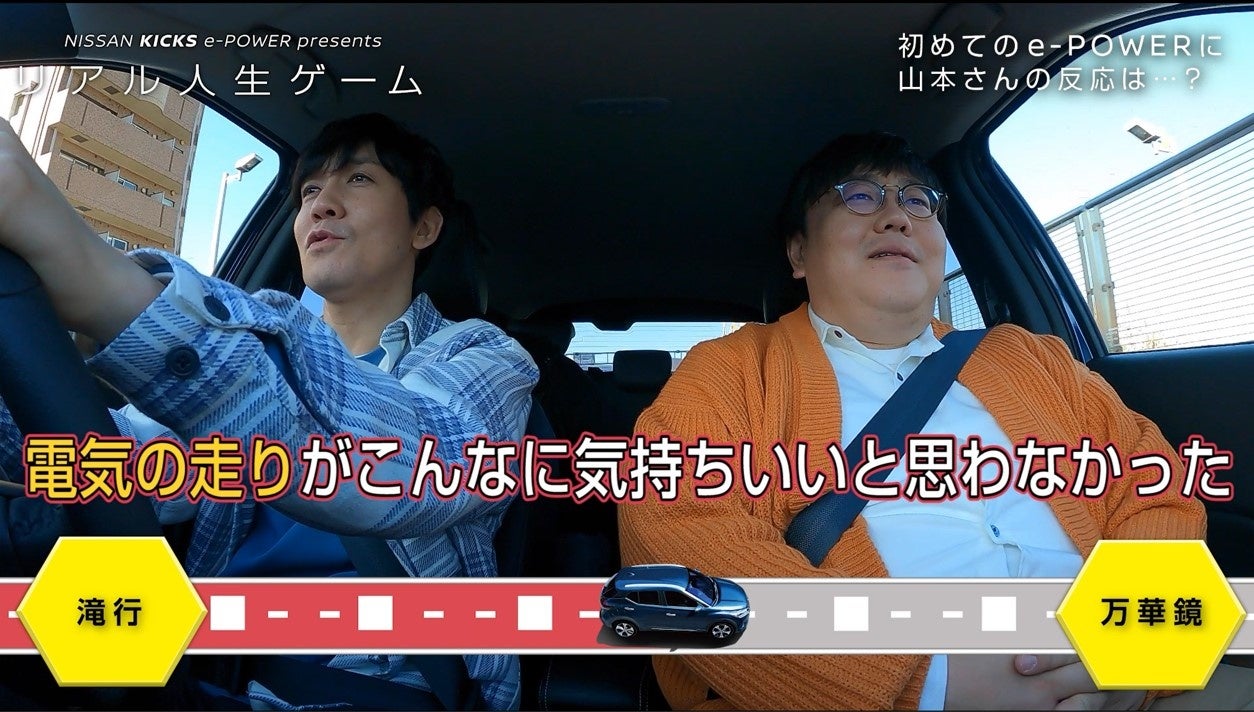 さらに、昨年12月にお笑い芸人「タイムマシーン3号」のお二人に挑戦いただいた「リアル人生ゲーム」の体験ムービーも同日より日産公式YouTubeチャンネルにて公開します。実際に「キックス e-POWER」のオーナーでもあるオーナー代表 関さんと、「キックス e-POWER」初ドライブの山本さんによるチャレンジ溢れる珍道中の模様を是非動画でお楽しみください。