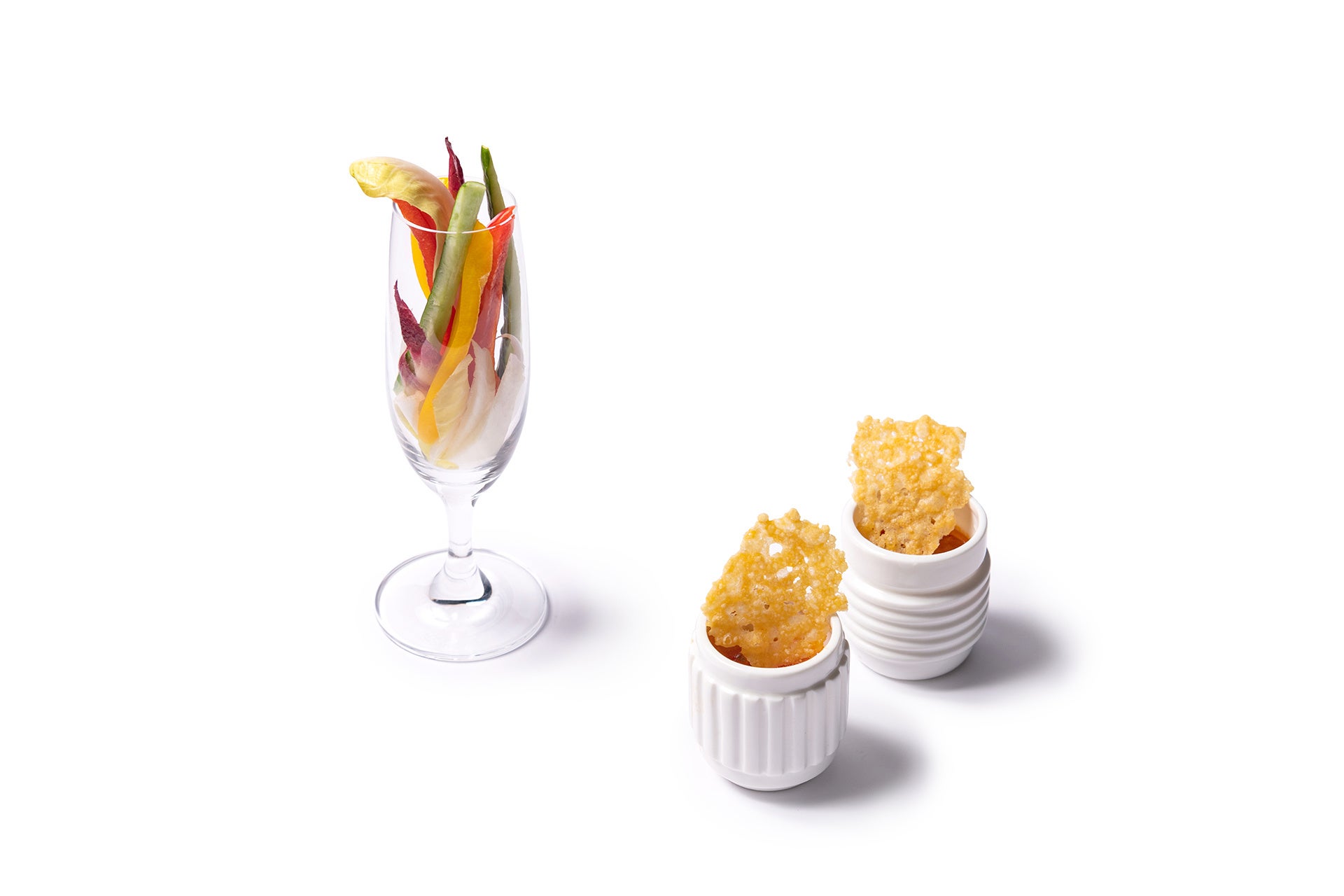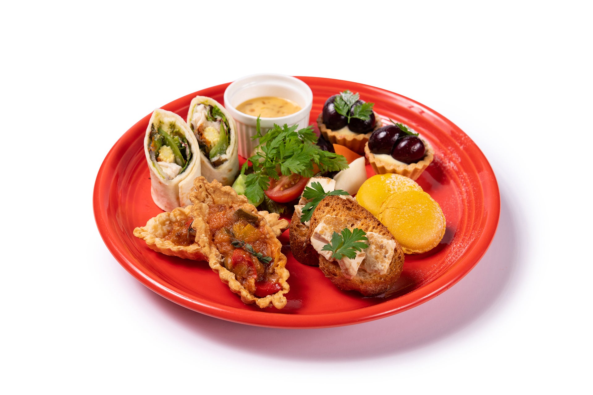 上段 季節野菜のラタトゥイユのタルト、クリームチーズのブルスケッタ、チキンと野菜のラップサンド、自家製ピクルス マカロン、フルーツタルト、野菜スティック 味噌マヨネーズ添え
